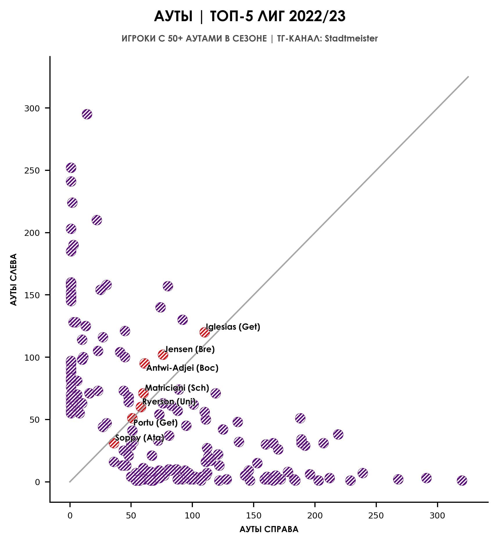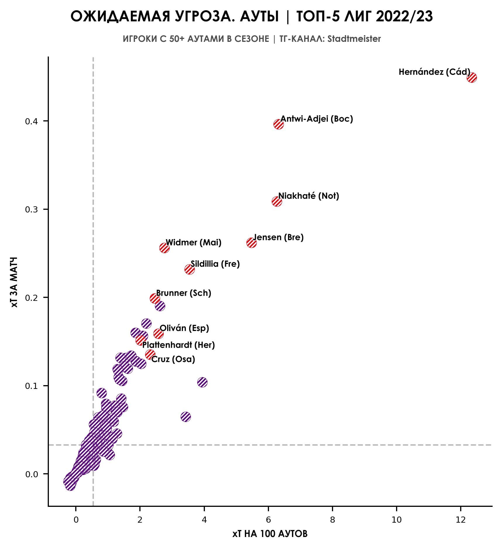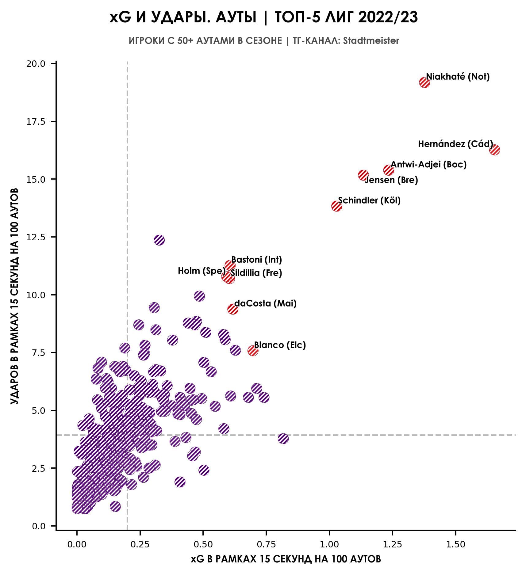 Игрок буквально разрывает лигу по ожидаемым угрозам от передач (хТ) после аутов, несмотря на то, что в топе ведущих европейских лиг довольно много представителей Бундеслиги — это лишь в очередной раз подтверждает тезис о том, что немецкие команды массово ищут возможность продвижения мяча вне ситуаций в открытой игре.