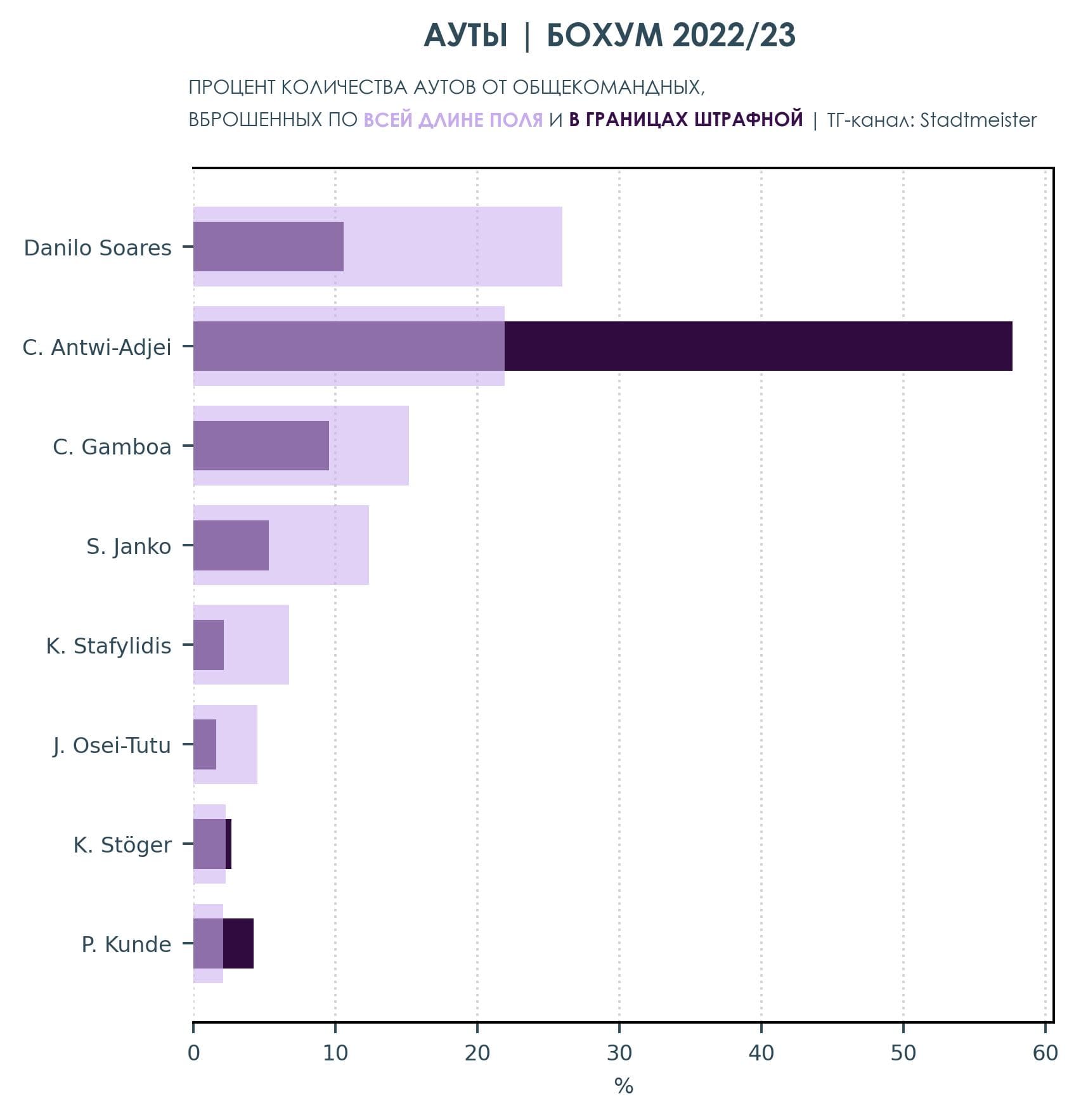 Очевидно, что треть команд испытывающих наибольшие проблемы при построении атак, пытаются наиболее эффективно использовать продвижение мяча в опасные зоны в периоды владений, которые начинаются со стандартных положений или забросов с аутов. «Бохуму», идущему в таблице по проценту владения на 14-м месте, а по нон-шот метрикам и того ниже, тоже пришлось искать свои инструменты. В результате, оружием команды стало качество вингера Кристофера Антви-Аджея далеко и точно вбрасывать мяч из-за боковой.