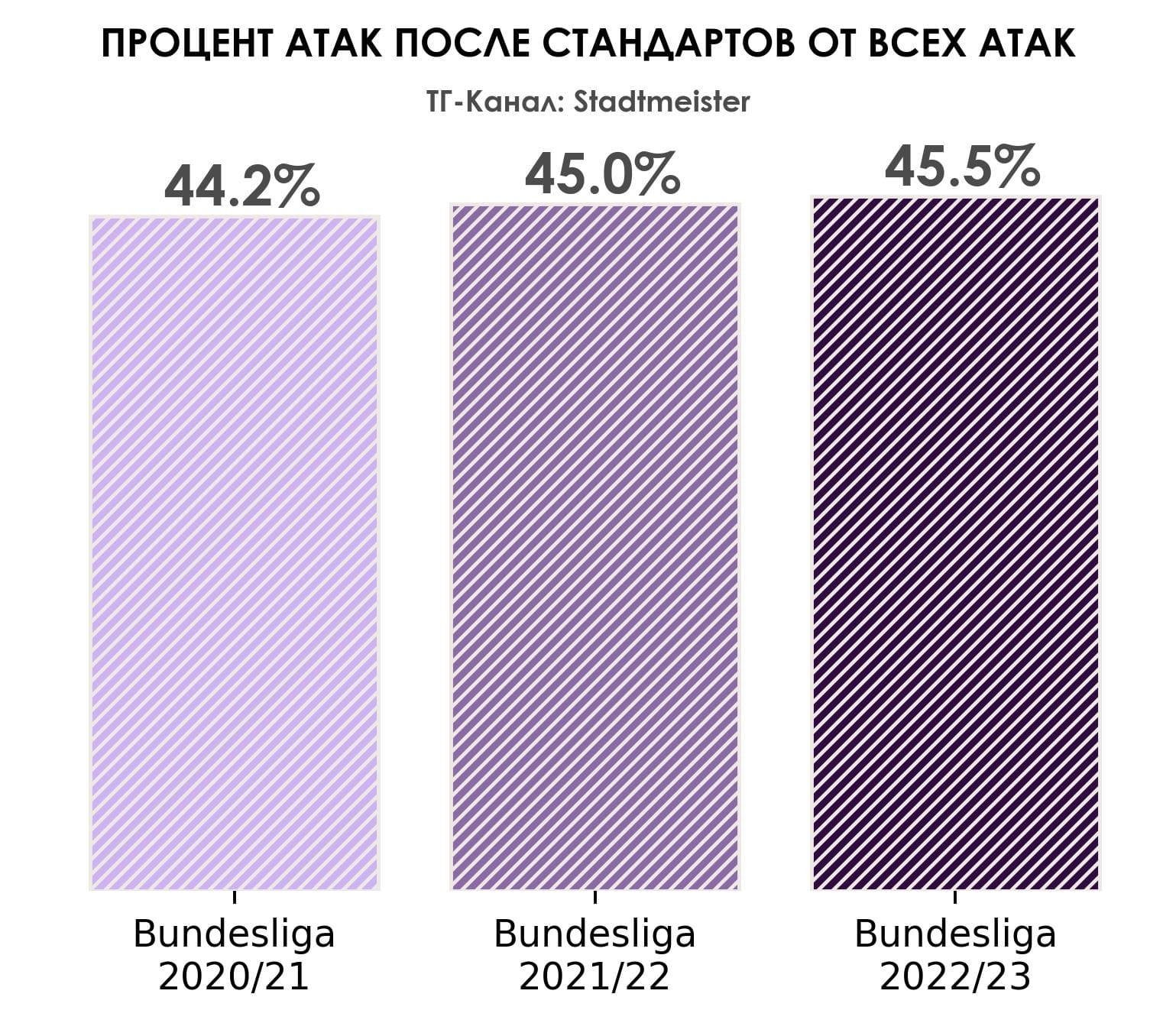 За последние несколько сезонов в Бундеслиге все больше проявляется тренд снижения доли атак «от голкипера», увеличивается число пауз и атак после стандартов. Возможно, появление такого тренера, как Хаби Алонсо в «Байере» и возвращение к работе Себастьяна Хенесса в «Штутгарте», если «швабам» удастся сохранить прописку, изменят ситуацию в следующем году, однако на пока статистические данные и визуальное ощущение говорят о сдвиге исключительно в одну сторону.