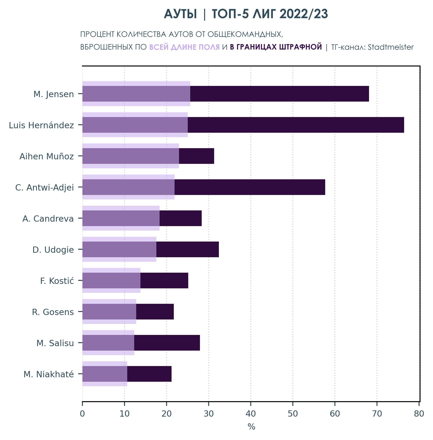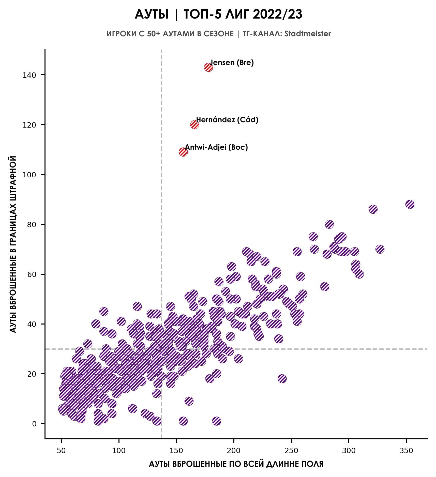 В то же время, если искать похожие случаи внутри топ-5 европейских лиг среди игроков как минимум с 50 попытками выбросов мяча из-за боковой, то на схожей с Антви-Аджеем разнице между всеми аутами и аутами, выполненными в границах штрафной, выделяются Матиас Йенсен из «Брентфорда» и Луис Эрнандес из «Кадиса».