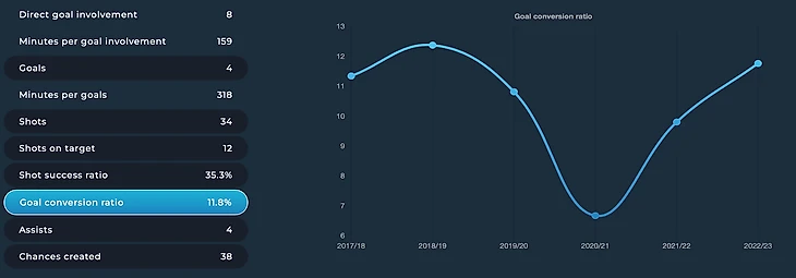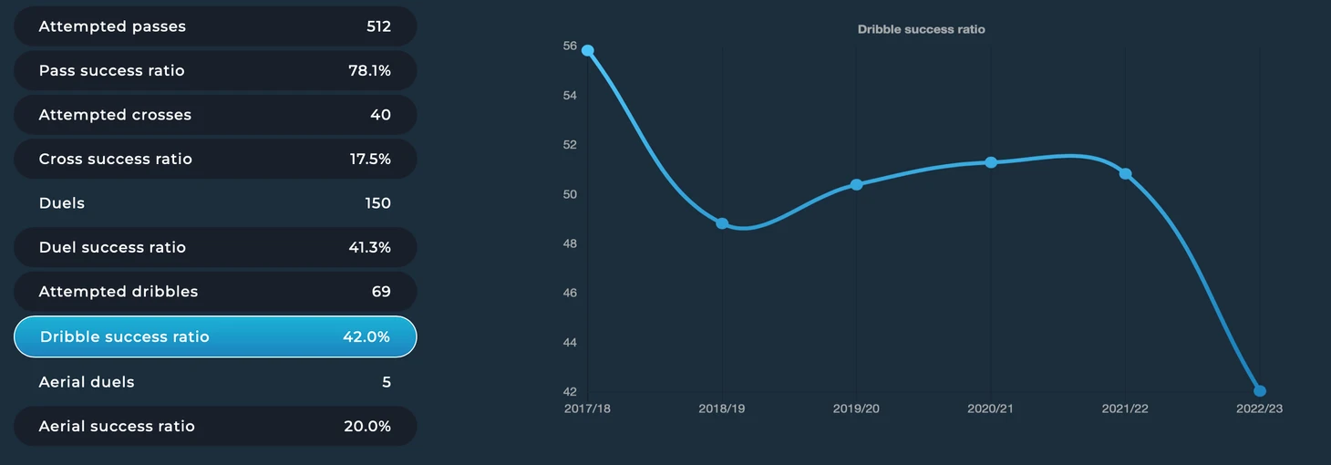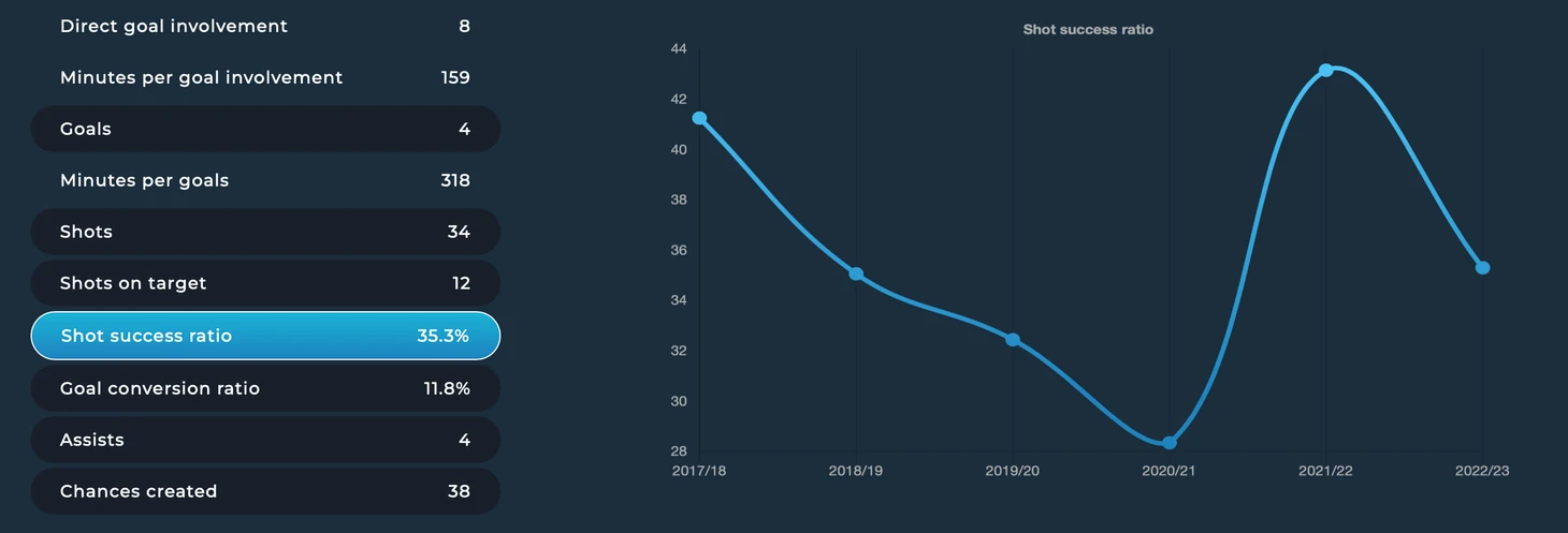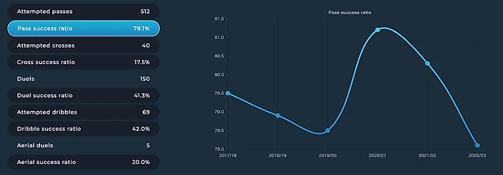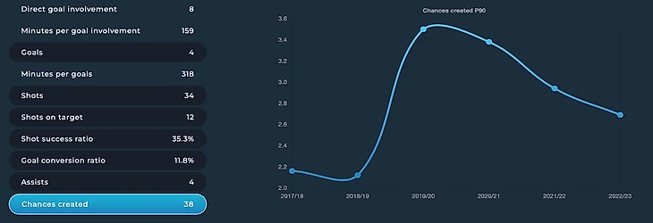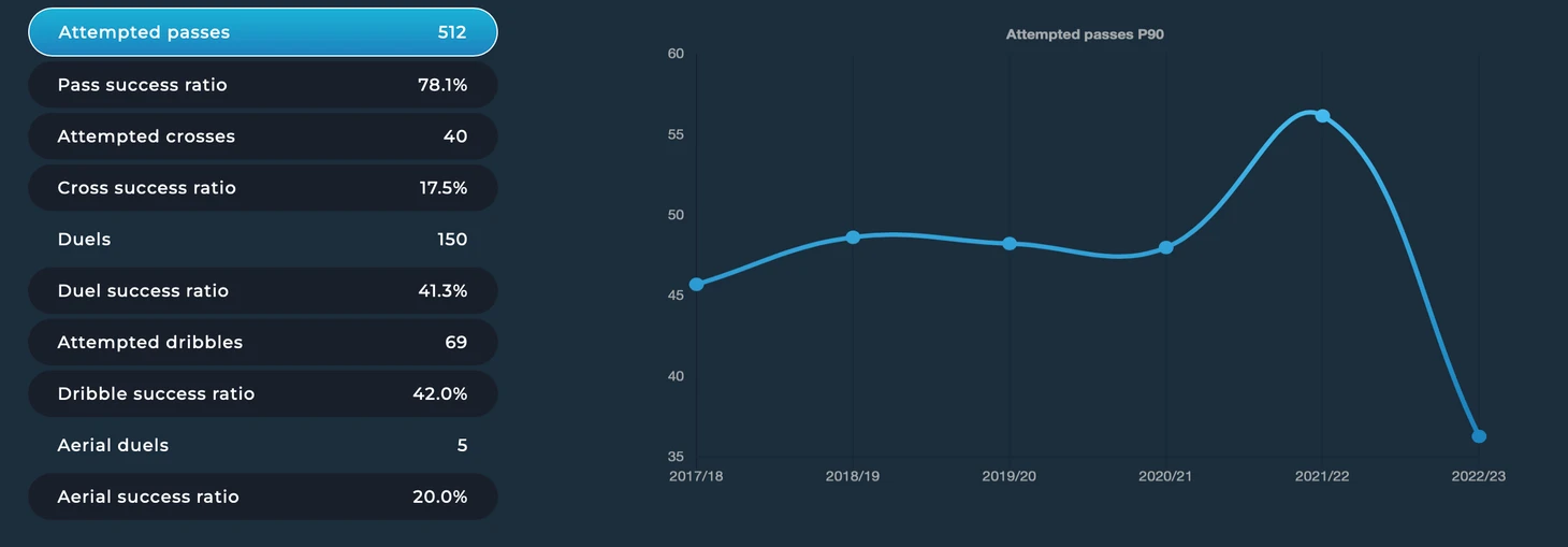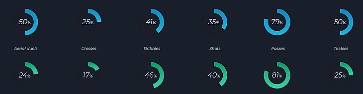 Если отмести в сторону чистую статистику голов и голевых передач, акцентировав внимание непосредственно на вовлечение в игровые действия, то и здесь Анхель не очень сильно просел в сравнении с самим собой, выполняя прежнюю работу фланового нападающего достойно в сравнении с самим собой.