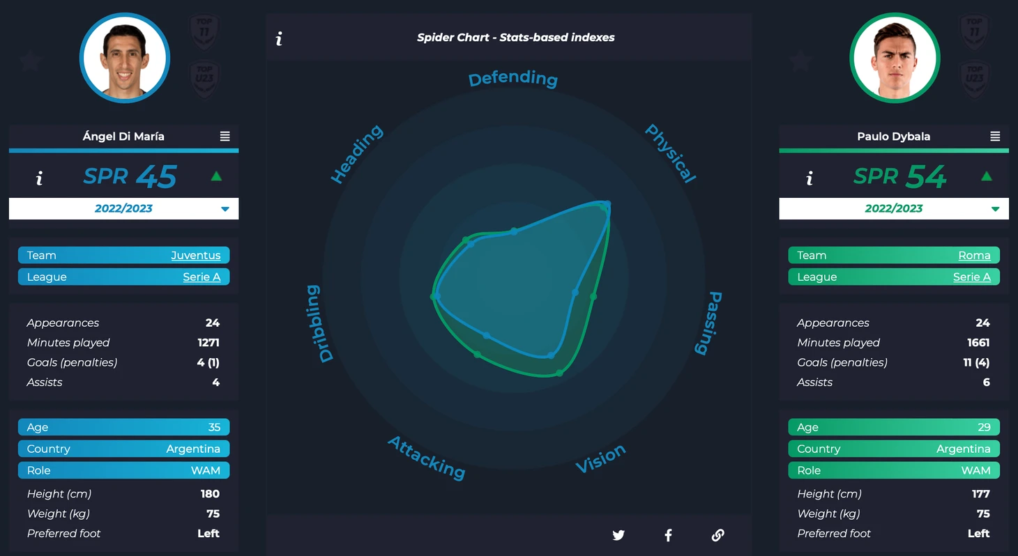 В остальном Ди Мария мало чем уступал играющему за Рому Дибале относительно процентного соотношения большинства совершаемых футболистом их амплуа действий. Ди Мария успешнее выполнял забегания по флангу, был опаснее в воздухе, чаще бросал партнеров в прорыв. Дибала был чуть точнее в передачах, ударах и надежнее в дриблинге, но этого мало, чтобы сильно жалеть о подобном размене.