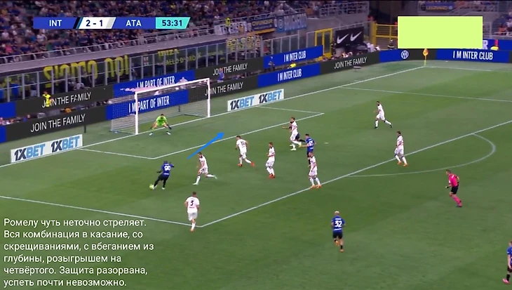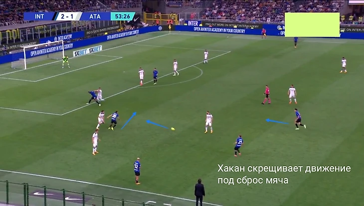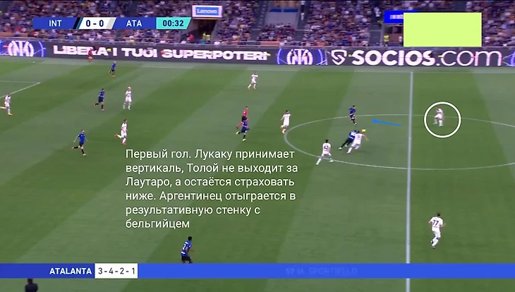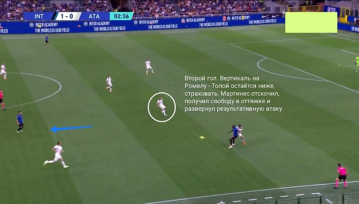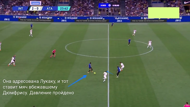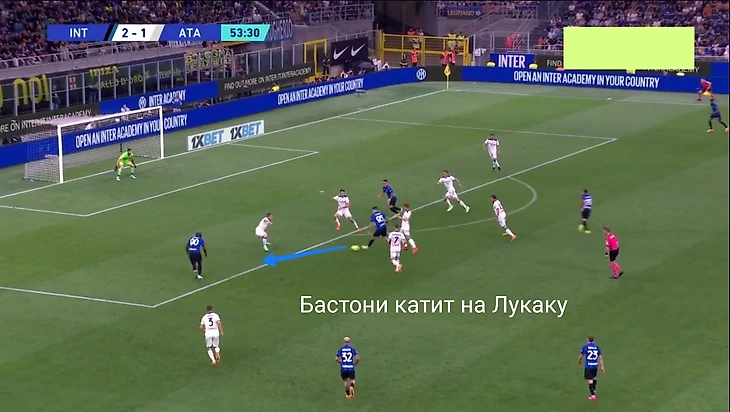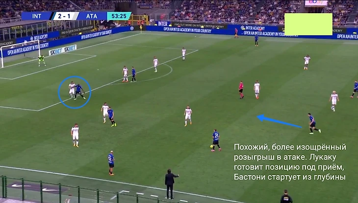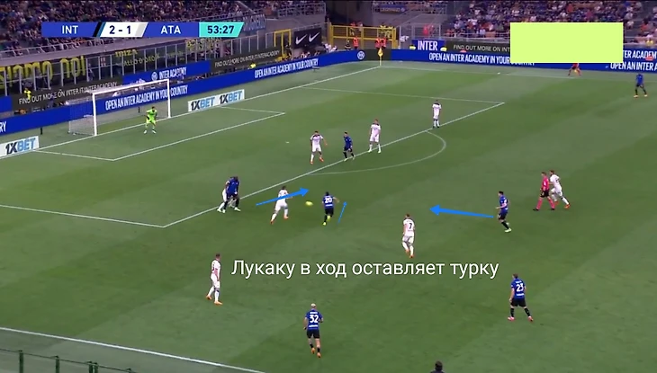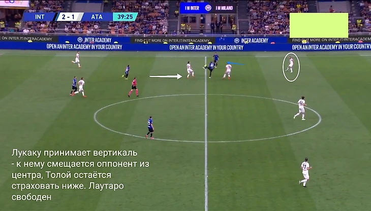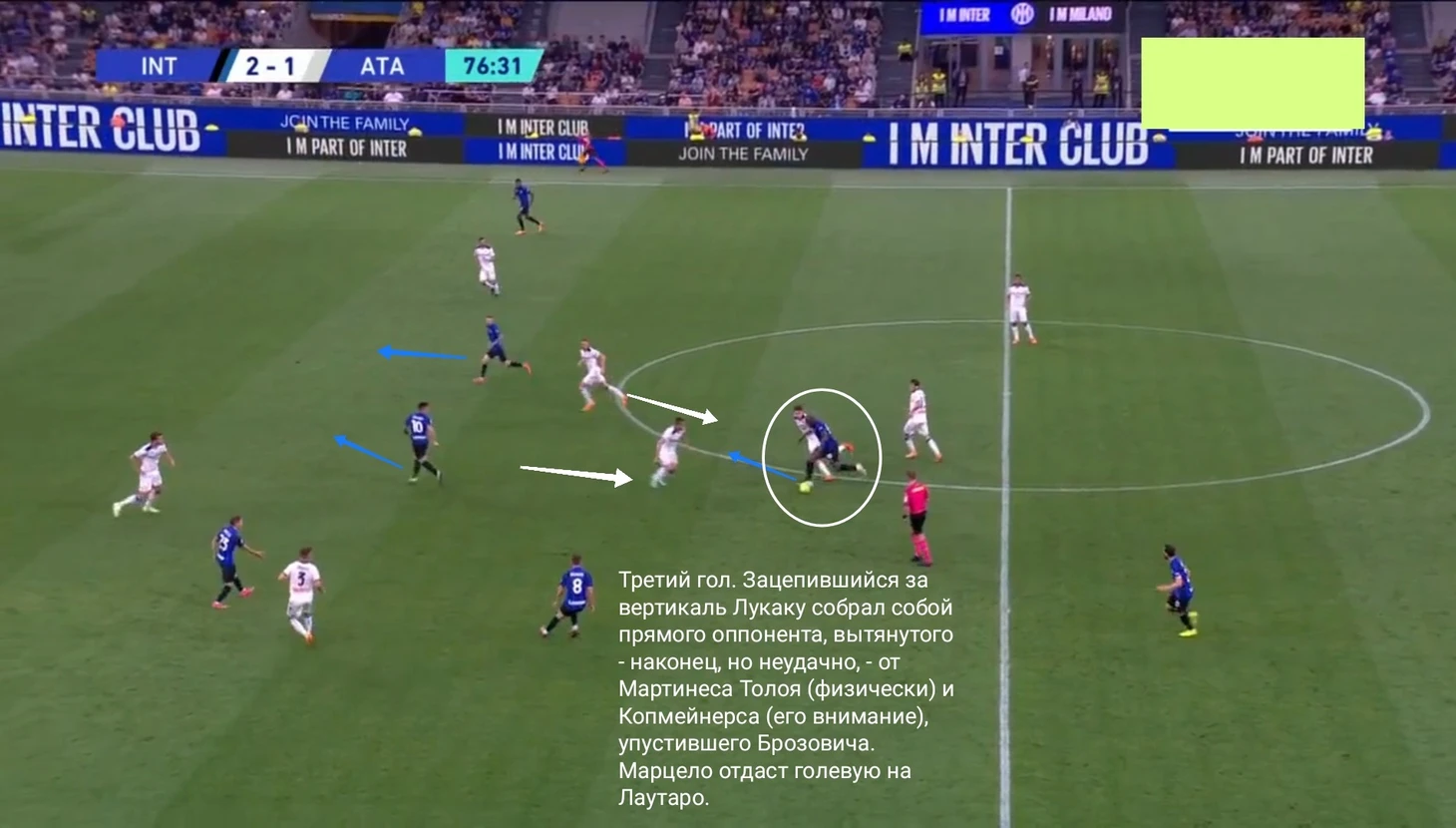 В-третьих, выход в старте Лукаку. Ромелу был важен не только как мощный адресат вертикальных передач, способный за любую из них крепко зацепиться – он, опасностью последующего, привычного для него разворота с мячом и индивидуального действия, стал вбирающим в себя внимание всех ближайших оппонентов, психологическим и физическим их стягиванием освобождающим партнёров. Было заметно, как после получения бельгийцем мяча прежде индивидуально опекающие соперников бергамаски переключались на подстраховку столкнувшегося с Лукаку партнёра, сжимаясь к ним для прямой помощи или оставаясь чуть ниже на случай прорыва – в любом случае их непосредственный подопечный получал свободу. Так были забиты все три гола, когда Толой или оставался страховать борящегося с Ромелу партнёра, не выходя за Лаутаро, или, наоборот, смещался на подмогу к дуэли бельгийца, также оставляя Мартинеса – получавший время и пространство аргентинец в первый раз отдал на Лукаку голевую после стенки, затем разогнал вольным пасом следующую результативную атаку, а в финале без опеки вбежал и под собственный мяч.