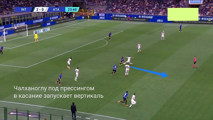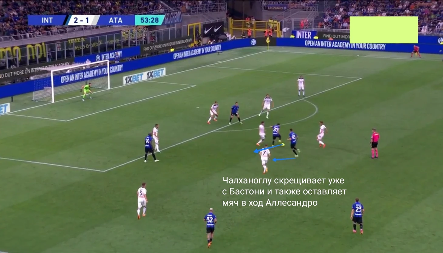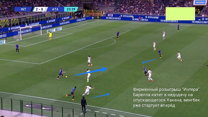 И, наконец, последняя, возможно, решающая лепта – увядание агрессии и плотности персонального прессинга «Аталанты». Общее больное место, превращение Бергамо из столицы догматичной дерзости в оплот циничного и осторожного выжидания, любопытно тем, что за один сезон не могло, разумеется, совершиться полностью и цельно. «Аталанта», радикально снизив интенсивность, напор и высоту давления, по-прежнему редко отказывается от персональных ориентировок. Против посредственных под давлением команд такая ремиссия смелости может ещё приносить результат, – простая высокая расстановка 1v1 с оппонентами уже сбивает нерасторопных с толку; наверное, жива ещё и память о цепких бергамасках; так неагрессивно-персональная форма обороны разбивает атаки соперника, – но против команд порядка «Интера», характерных подготовленными выходами из-под прессинга, это странное сочетание индивидуальных ориентировок и высокой встречи с низкой плотностью и малой агрессией даёт то, что вчера и разбило дебют «Аталанты». Соперник свободно держит мяч внизу на своей трети, тянет податливое Бергамо во всех направлениях и запускает мяч на созданное пространство, а там, также без вгрызающихся в спину защитников, свободно разбираются нападающие.