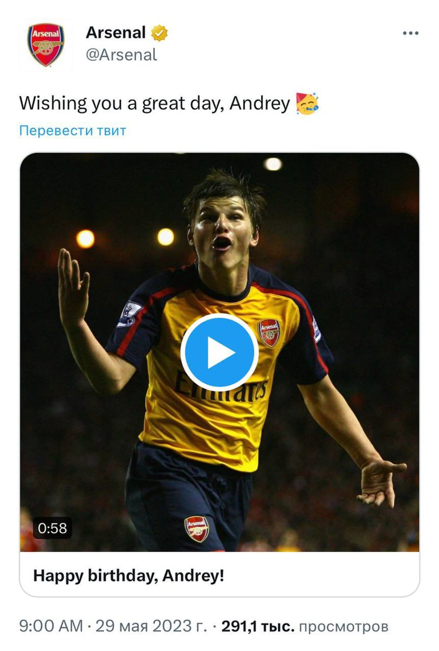 29 мая родился Андрей Аршавин – об этом вспомнил лондонский «Арсенал» и вывесил поздравление в твиттере, сопроводив его надписью «Отличного дня, Андрей». Конечно, с видео его покера в ворота «Ливерпуля» на «Энфилде».