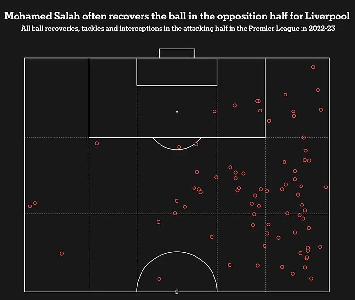 Когда «Ливерпуль» теряет мяч рядом с Салахом, египтянин очень редко остаётся на месте. Количество отборов и перехватов, которые он совершает в атаке, говорит само за себя.