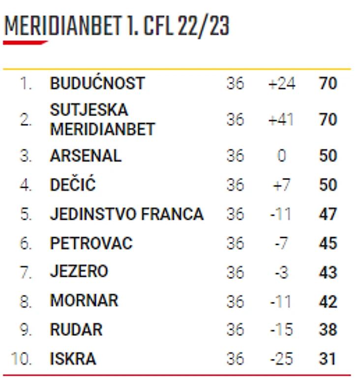 Завершился очередной розыгрыш чемпионата Черногории по футболу. Титул в этот и в шестой раз в истории независимой Черногории взяла столичная «Будучность». Судьба титула решалась в последнем туре, где команде была необходима победа на выезде в Баре. «Будучность» сумела выиграть с минимальным счетом. Хотя в начале мая отрыв от ближайшего преследователя составлял 7 очков, однако все это преимущество было растеряно к последнему туру и казалось, что «Будучность» будет косплеить «Арсенал». Но нет, титул уехал в Подгорицу. Кстати это чемпионство стало десятым титулом в истории команды со времен обретения независимости Черногории. Шесть чемпионств и 4 кубка.