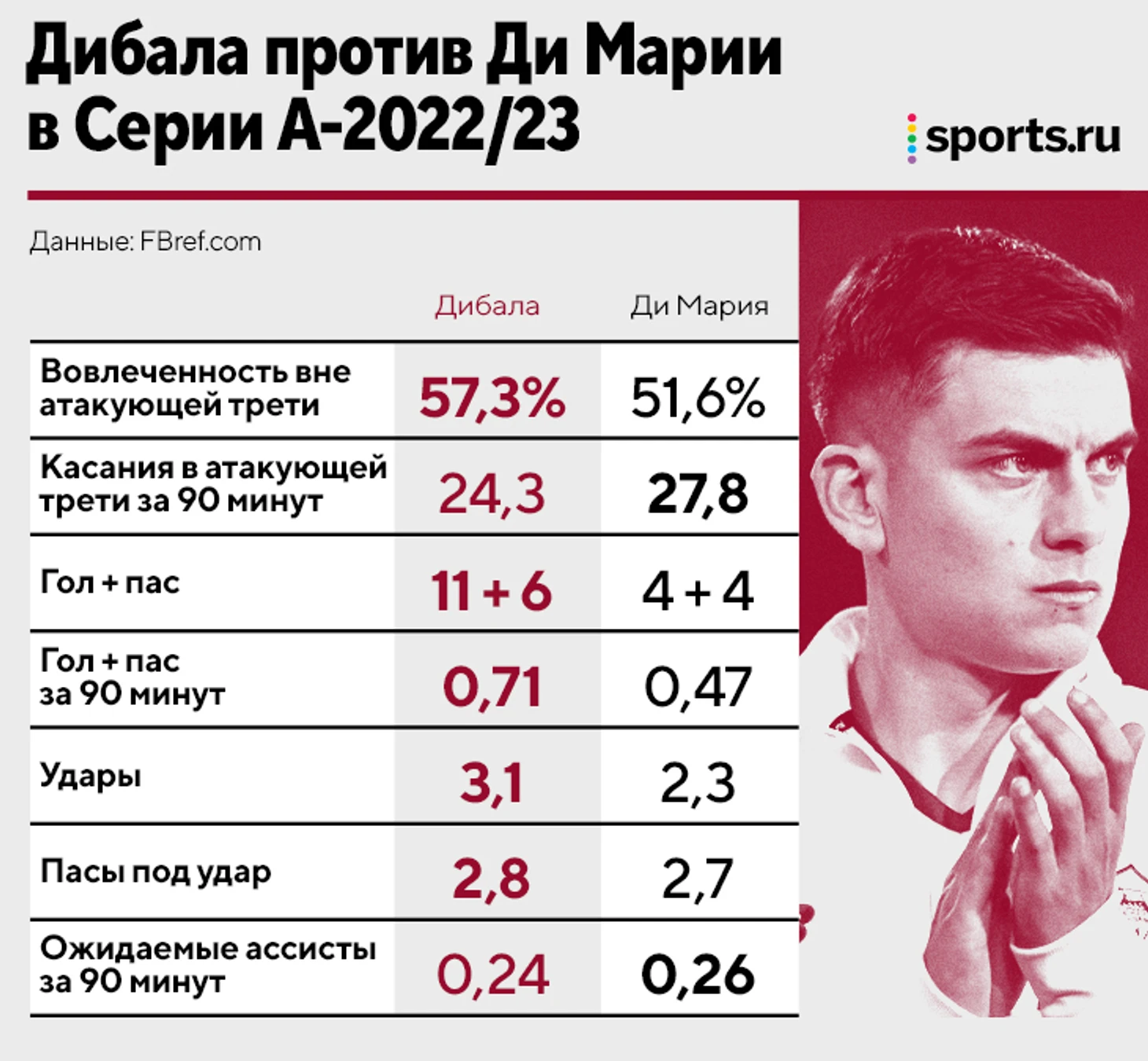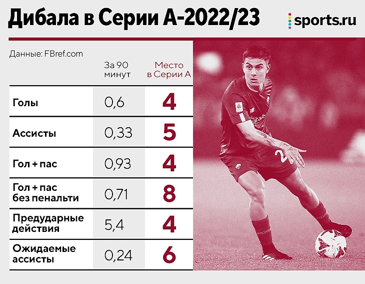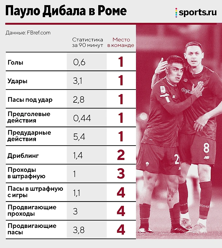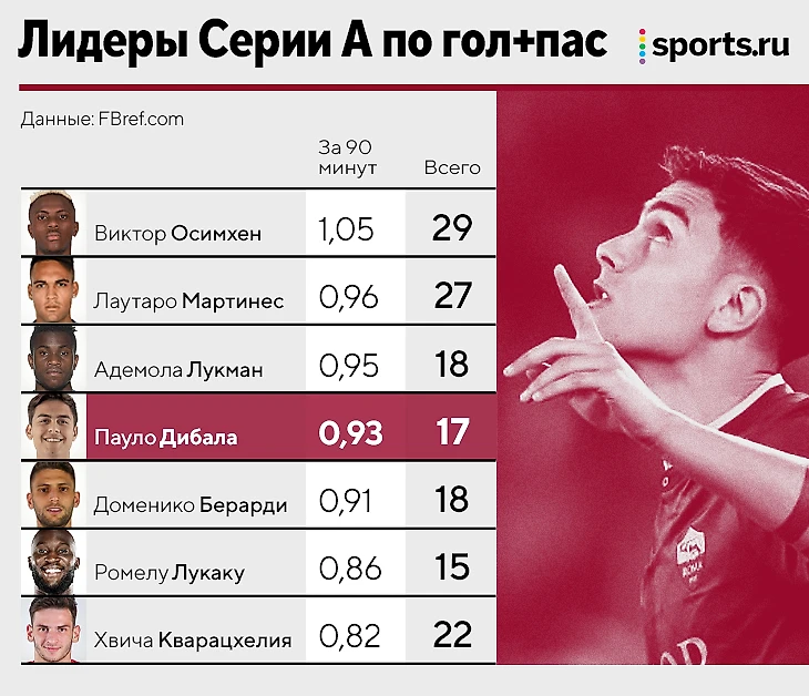 Вклад Дибалы беспримерен. В мире почти нет игроков, которые на одинаковом уровне влияют на продвижение мяча и результативность команды, а Пауло выделяется даже на фоне форвардов. Он быстрее всех в истории «Ромы» набрал 10 баллов по гол+пас (в 13 матчах), идет по сезону со 102 минутами на результативное действие (16+7) и держится в четверке Серии А по гол+пас.