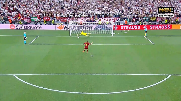 ❌ 2:1! Манчини бьет очень сильно, но по центру. Так сильно, что Буну, падающий в угол, успел ногой отбить удар.