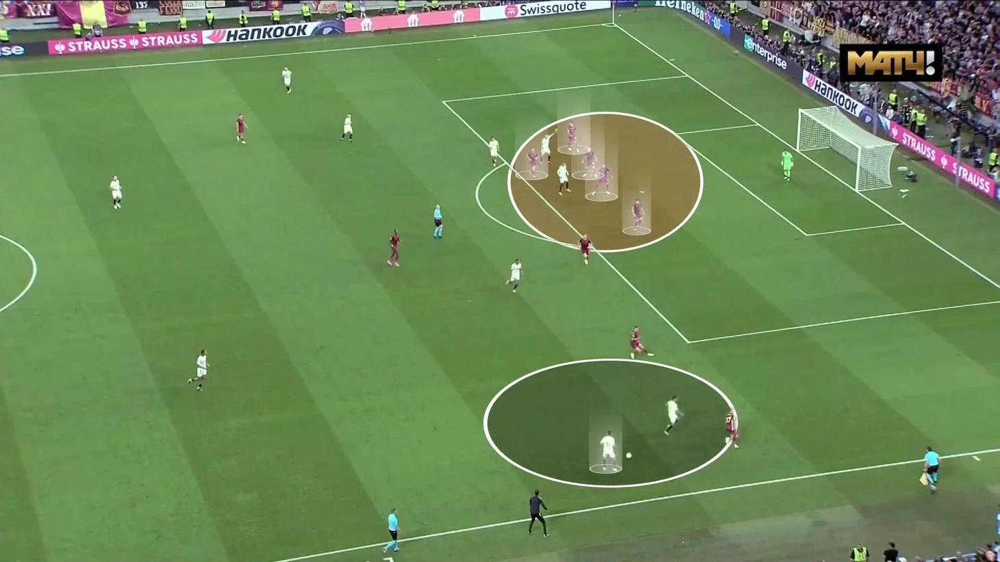 Разумеется, Моуринью подготовился. «Рома» понимала, что угрозы в центре не будет, и смещалась так, чтобы вовремя накрывать фланги. Как только мяч оказывался в потенциальной зоне навеса, «Рома» слаженно реагировала.