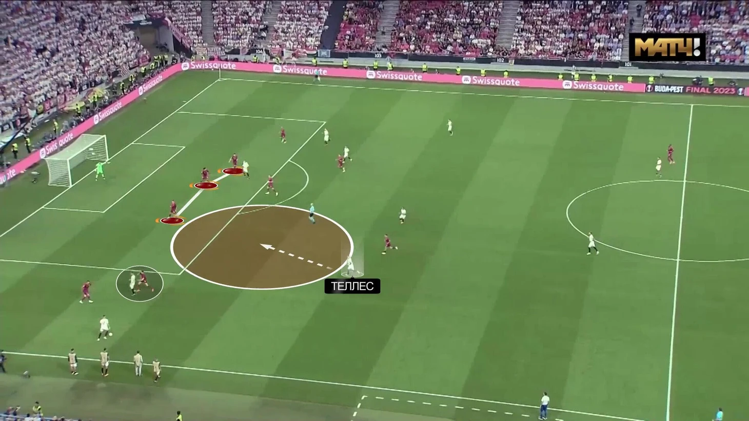 В редких случаях зона угрозы смещалась, но первопричина была той же. Например, тут Кристанте убежал страховать фланг, бросив дыру в опорной. В стандартном рисунке в схеме «Ромы» сюда мог бы выдвинуться правый центральный защитник, но вчера задача была в первую очередь следить за навесами. Зону игнорируют – Теллес опасно подключается: