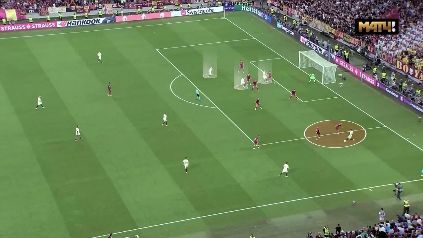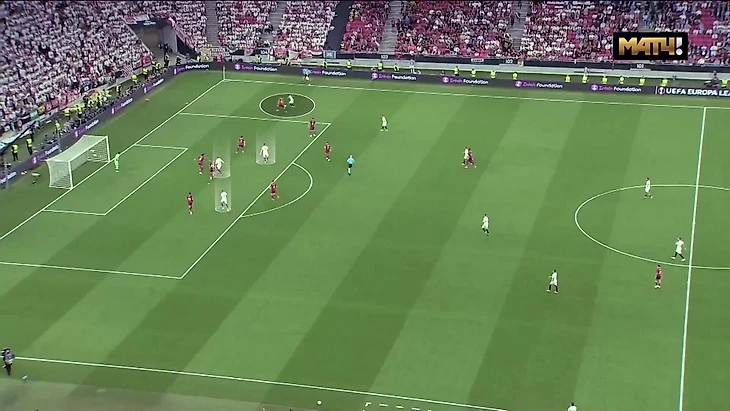 В результате возникала одна из двух ситуаций. Первый сценарий – навес из глубины в момент, когда «Севилья» еще не насытила штрафную. 1-2 игрока оказывались против всех защитников «Ромы»: