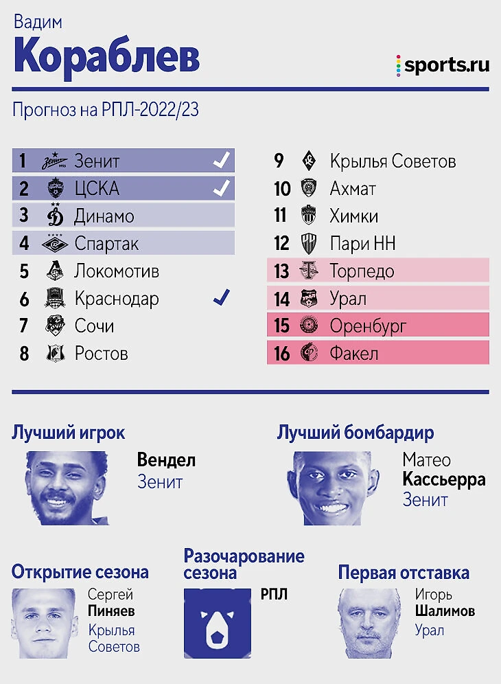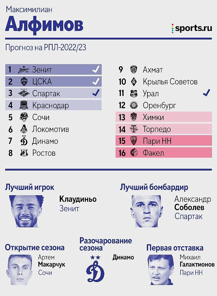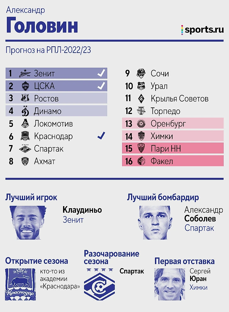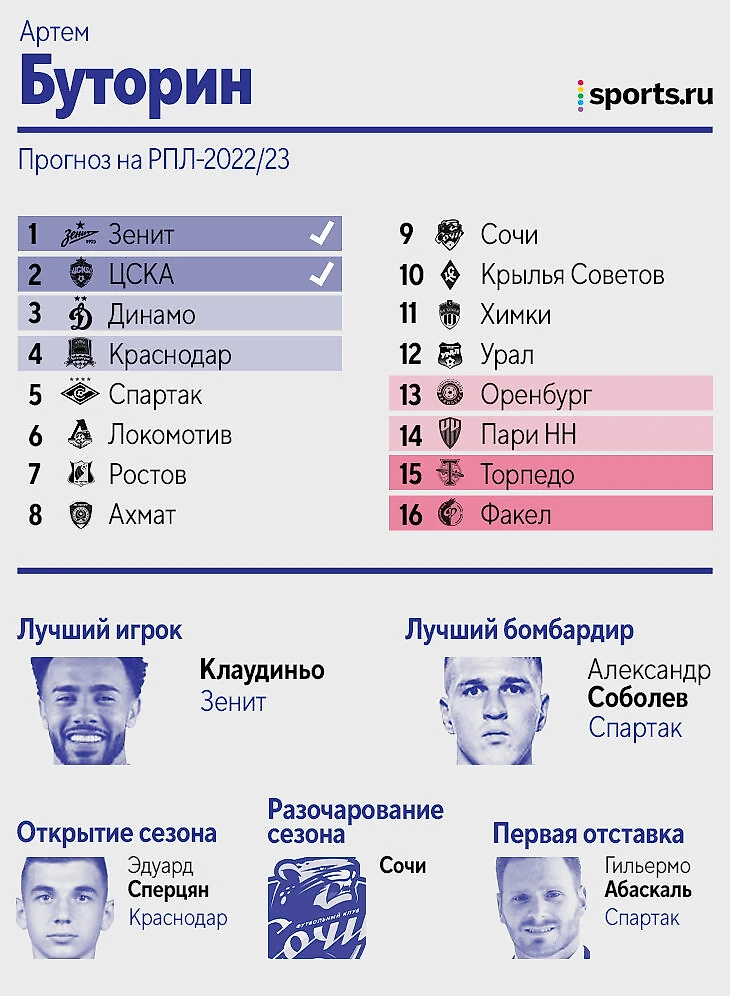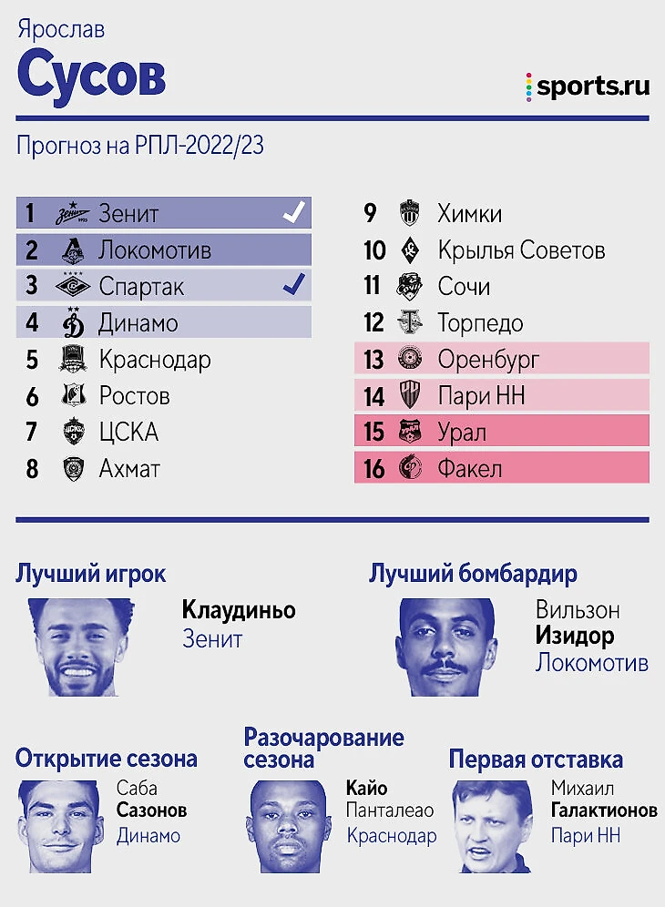 Цитата из прогноза: «Зенит» – просто команда из другой лиги, не вижу конкуренции совсем. Дальше исходил из того, кто меньше всех терял игроков, либо лучше это компенсировал. «Динамо», если найдет еще 1-2 центральных защитников, вполне способно оказаться в тройке. У Федотова первый сезон всегда не самый мощный, плюс пока новые трансферы ЦСКА идут очень вяло. «Крылья» потеряли слишком многих игроков, вокруг которых строилась команда, а «Пари НН» на одних стандартах выше 13-14 места вряд ли заберется. «Сочи», если вдруг потеряет еще и Нобоа, может и вовсе вылететь. В Карпина верю, а вот в «Спартак» нет».