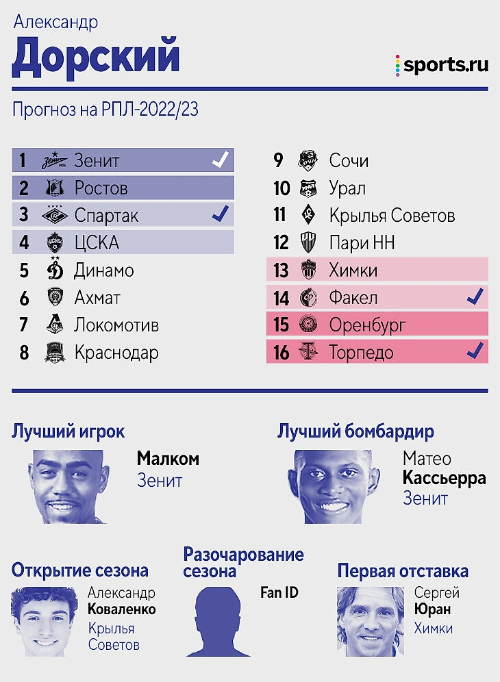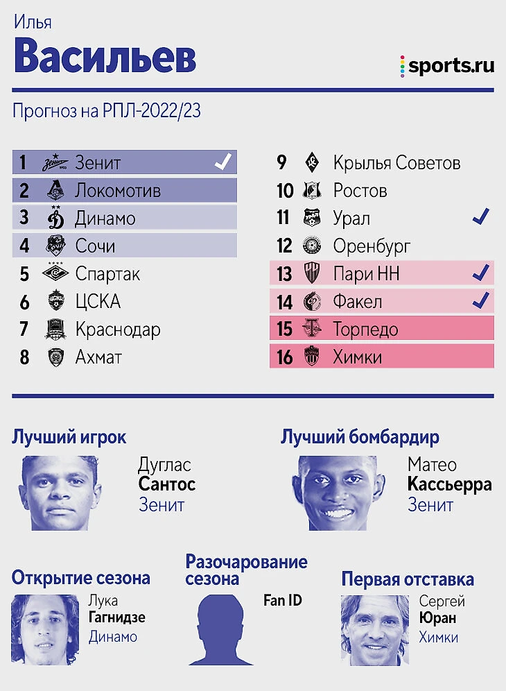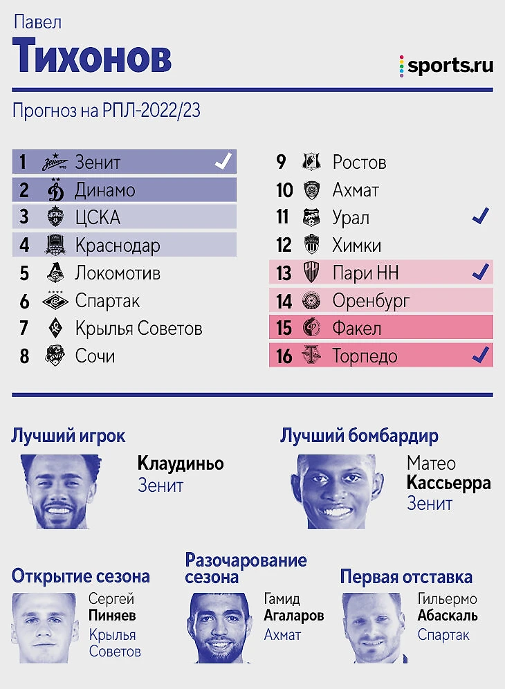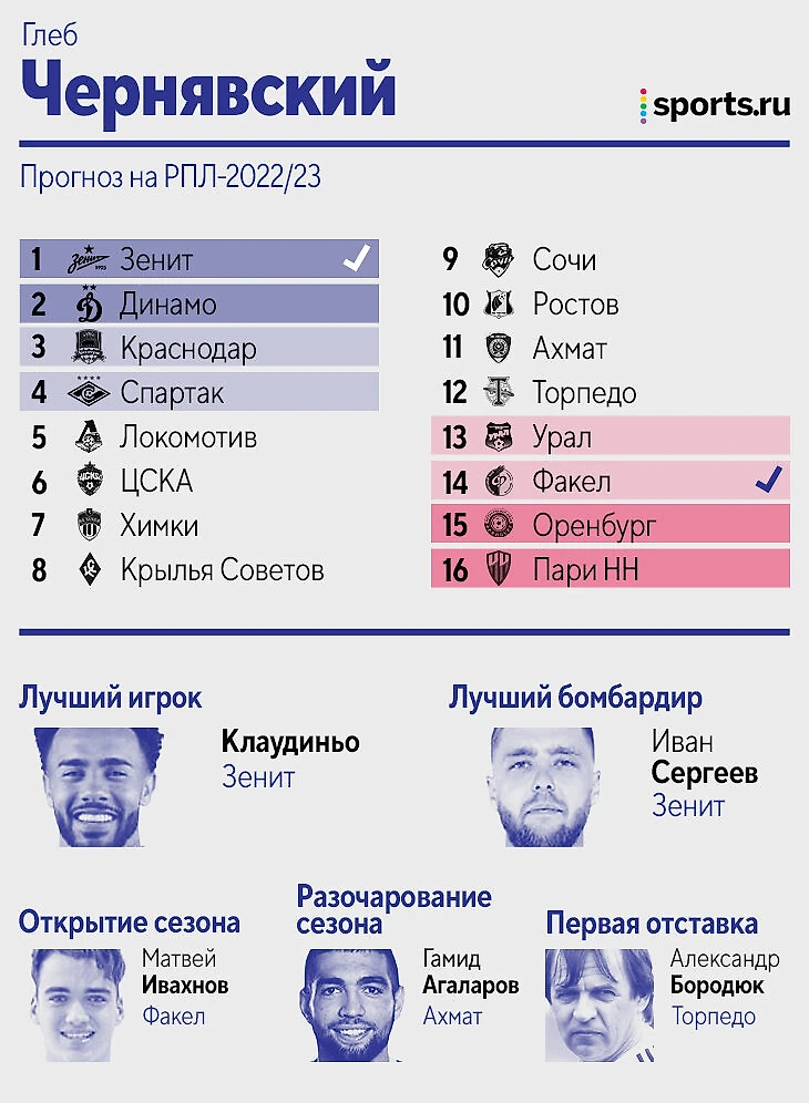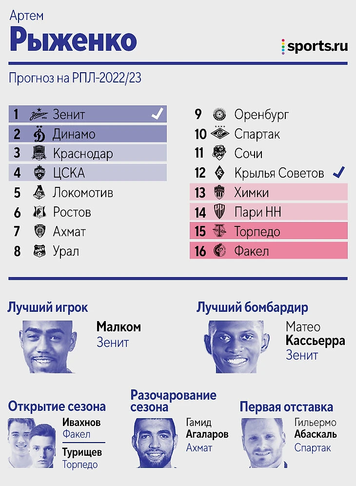 Цитата из прогноза: «Зенит» – просто команда из другой лиги, не вижу конкуренции совсем. Дальше исходил из того, кто меньше всех терял игроков, либо лучше это компенсировал. «Динамо», если найдет еще 1-2 центральных защитников, вполне способно оказаться в тройке. У Федотова первый сезон всегда не самый мощный, плюс пока новые трансферы ЦСКА идут очень вяло. «Крылья» потеряли слишком многих игроков, вокруг которых строилась команда, а «Пари НН» на одних стандартах выше 13-14 места вряд ли заберется. «Сочи», если вдруг потеряет еще и Нобоа, может и вовсе вылететь. В Карпина верю, а вот в «Спартак» нет».