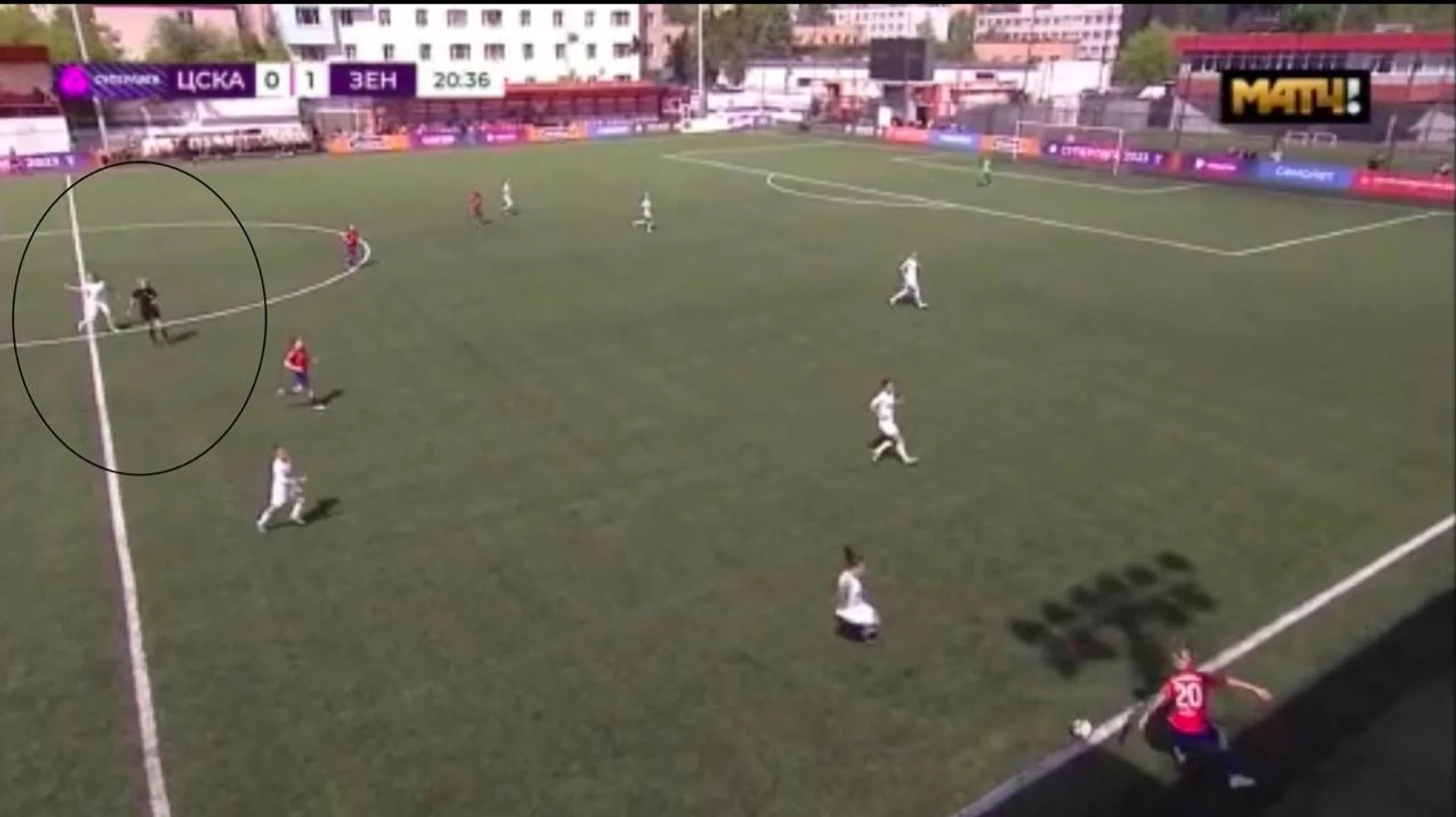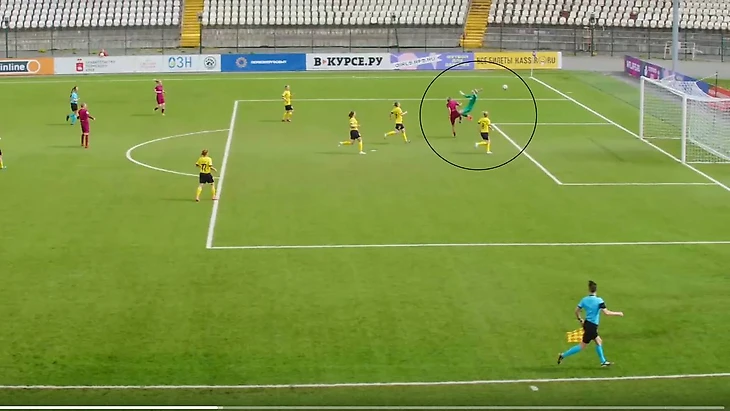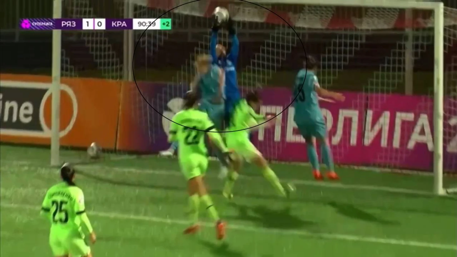 На 26-й минуте матча Вахрушева назначает пенальти в ворота «Енисея» якобы за опасную игру вратаря Ангелины Цырульниковой. Контакт между футболистками действительно был, только вот произошел он по инерции в тот момент, когда нога вратаря уже находилась на газоне. В этом моменте судья должна была продолжить матч.