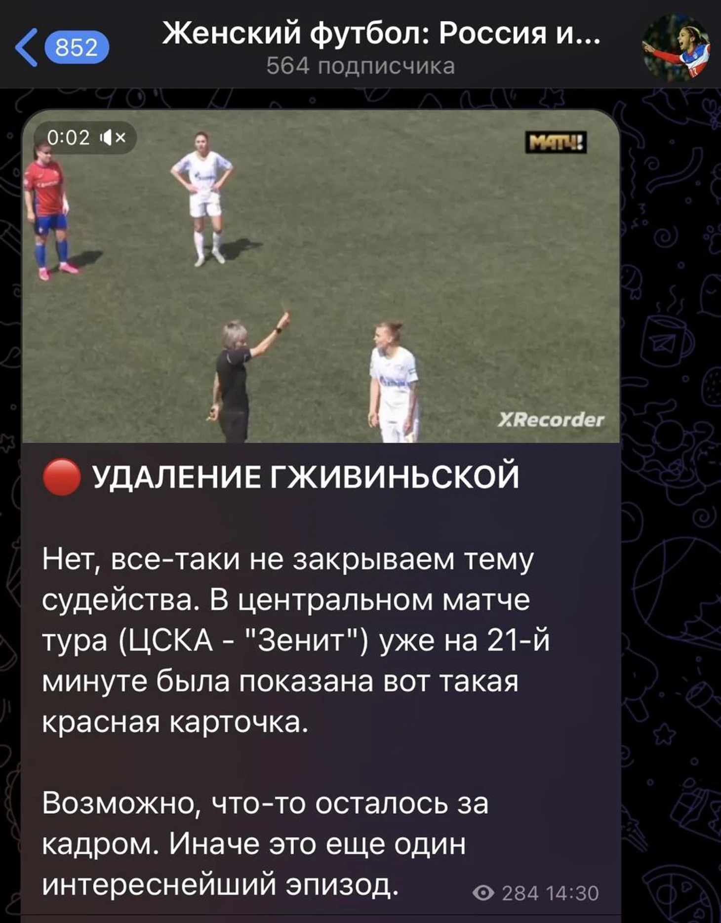 Удаление игрока «Зенита» — не единственный странный момент в отношении судьи к игрокам. Футболисток из Петербурга буквально бьют на поле, но судьи закрывают глаза. Вот, например, что по этому поводу пишут немногочисленные телеграмм-каналы о женском футболе: