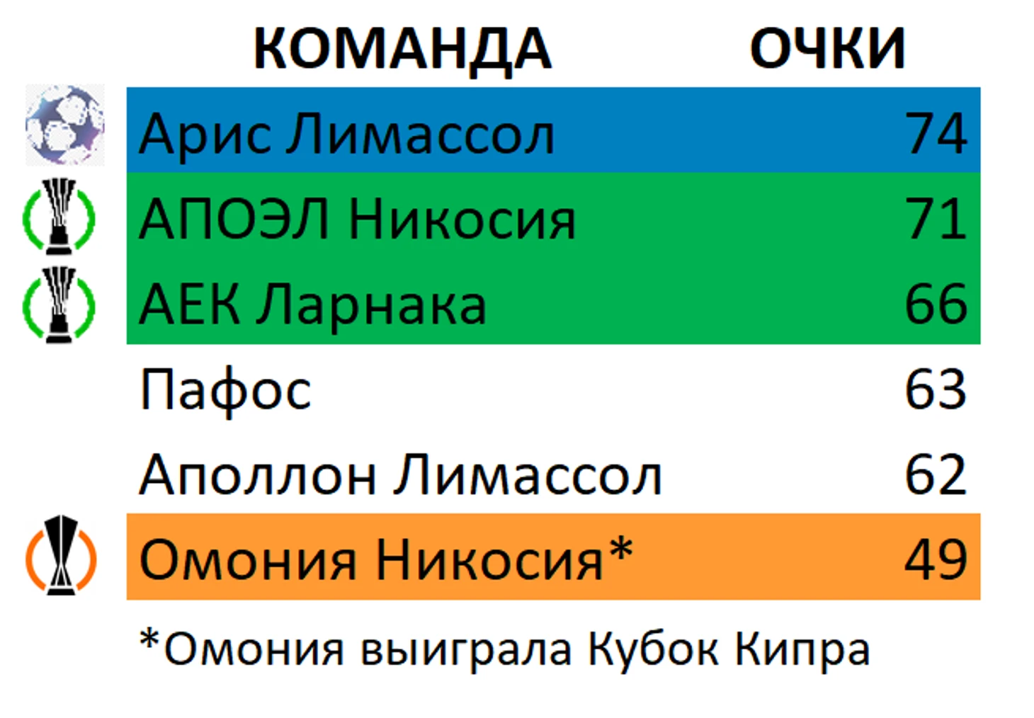 Чемпионами Кипра в этом году стал Лимассольский “Арис” который знаменит в среде русскоговорящих болельщиков потому что там играет известный российский нападающий Александр Кокорин. “Арис” обеспечил себе победу ещё за два матча до окончания сезона обыграв прошлогодних чемпионов “Аполлон Лимассол”. Команда Алексея Шипилёвского забила 65 голов за 36 матчей, что является рекордом лиги в этом сезоне. Пропустив всего 28 мячей, “Арис” идёт на втором месте после столичного “АПОЭЛа” в рейтинге лучшей защиты в лиге (26). Всего “Арис” выиграл 21 матч, сыграл 11 вничью, проиграл всего 4 матча. Итого “Светлая Бригада” набрала 74 очка.