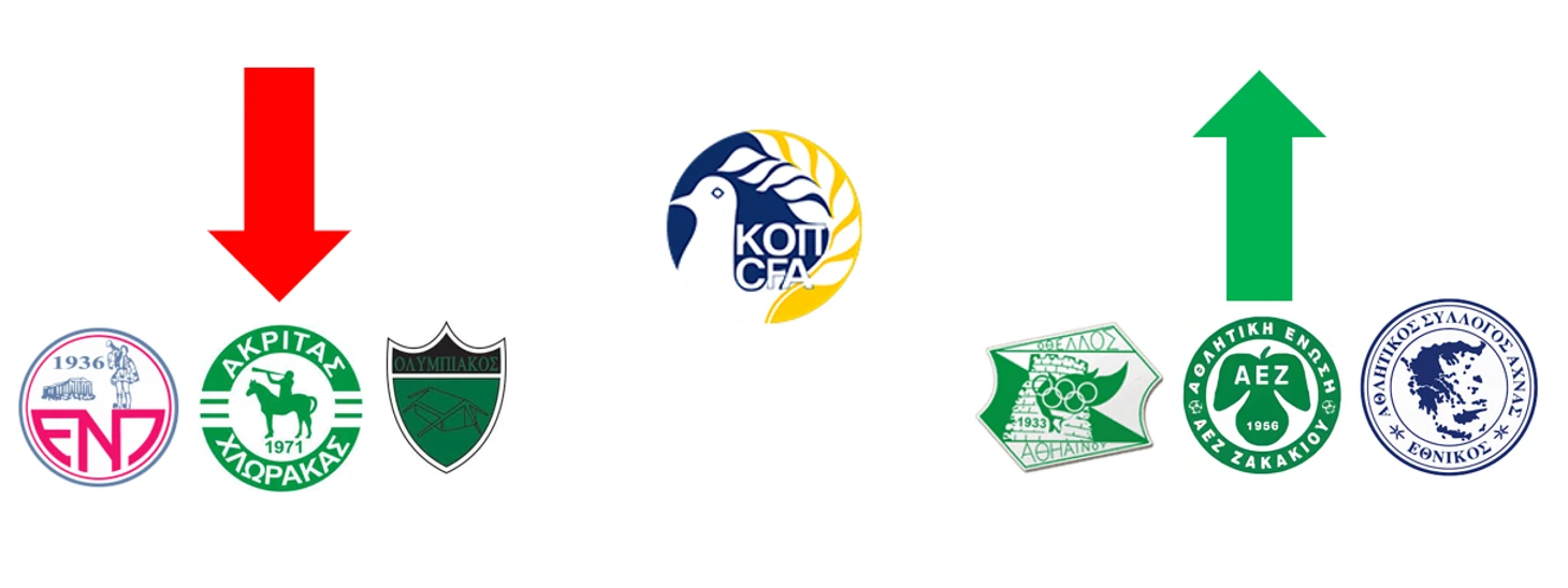 По итогу прошедшего сезона высшую лигу покинули “Олимпиакос Никосия” набравшие 28 очков за 40 матчей, “Акритас Хлоракас” которые в прошлом году перешли в элиту, и “Эносис Неон Паралимни” получившие 37 очков. Чемпионы второго дивизиона “Оттелос Афиену” из одноимённой деревни вернулись в элиту спустя 8 лет отсутствия. Вмест с ними в первый дивизион прошли “АЕЗ Закакиу” из Лимассола, а также “Этникос Ахна” вернулись спустя сезон отсутствия.