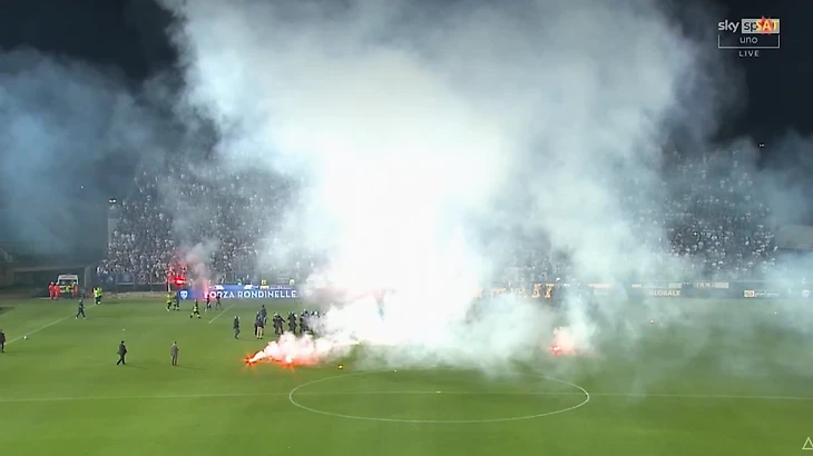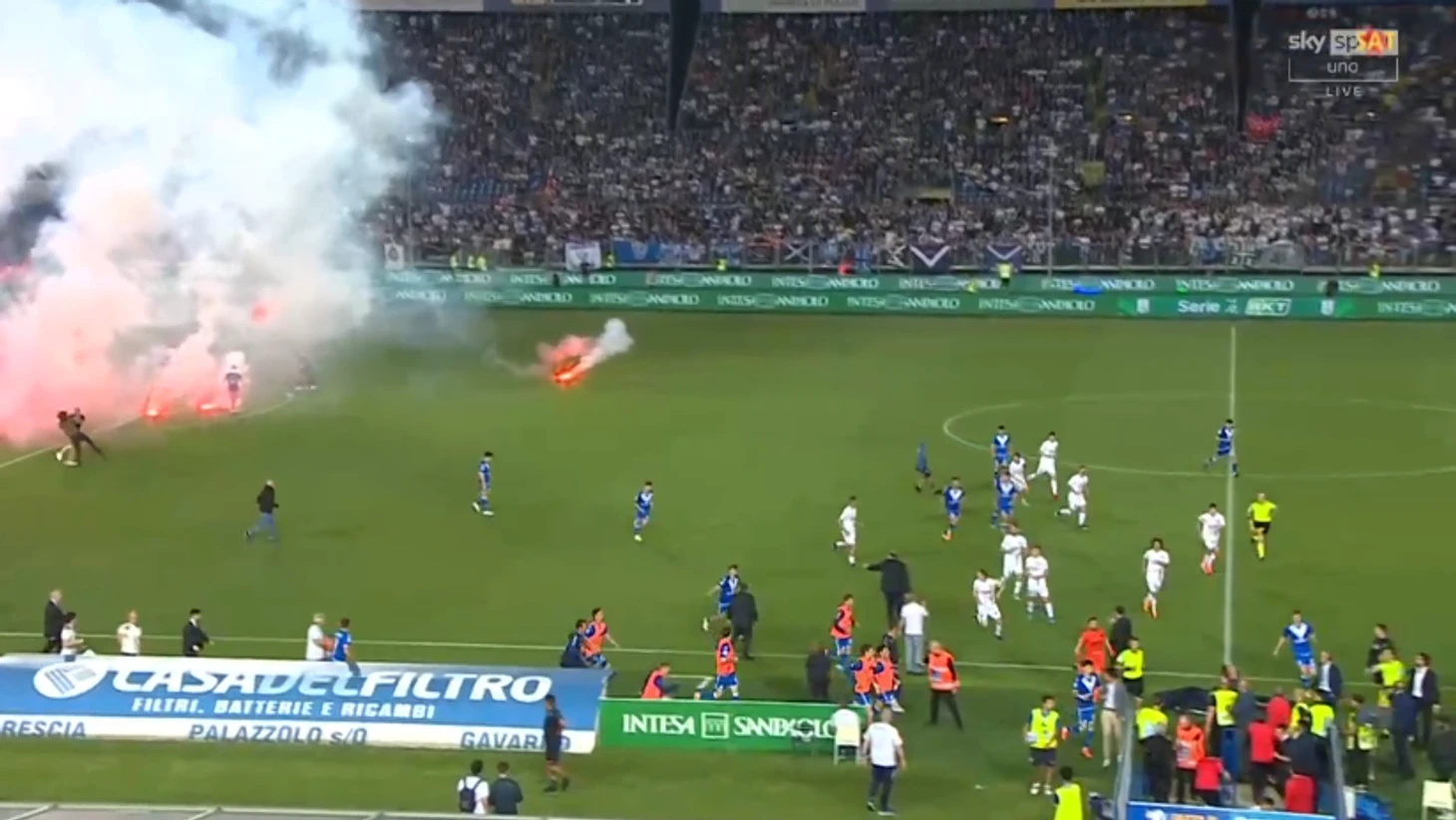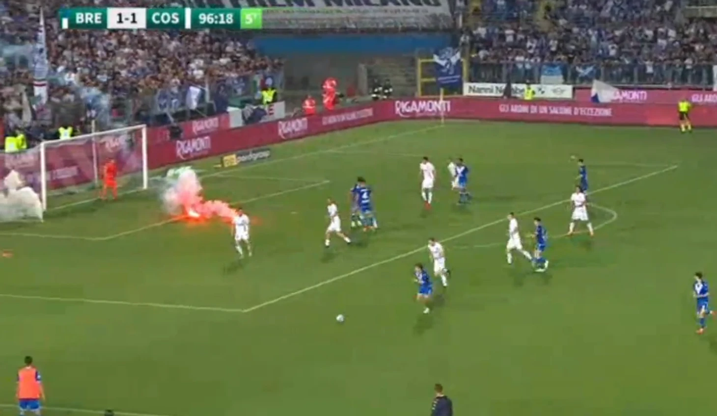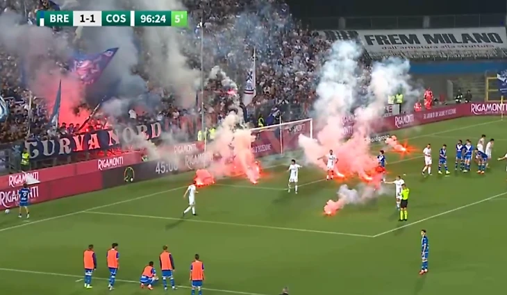 Но именно «Козенца» сравняла счет на 90+5. Еще через две минуты матч был прекращен досрочно. Во время одной из последних атак «Брешии» на поле полетели файеры.