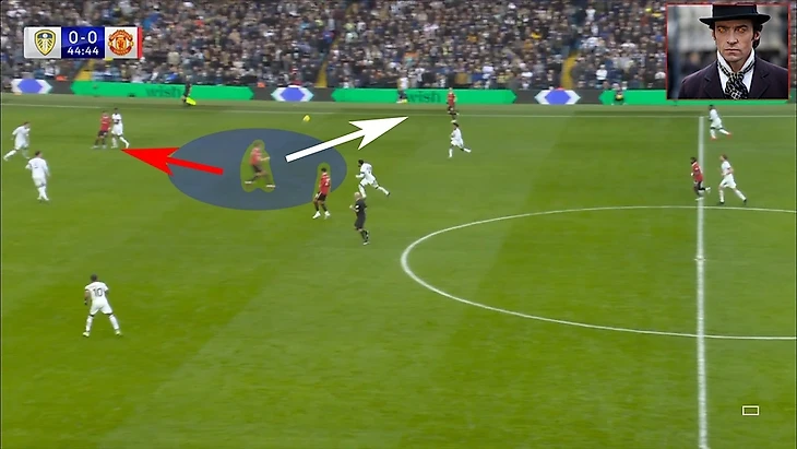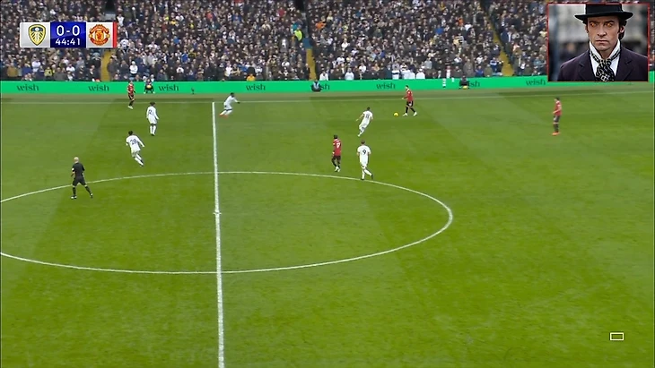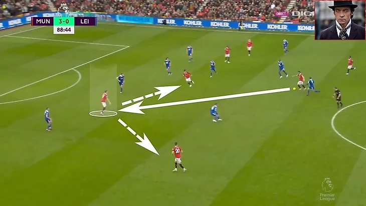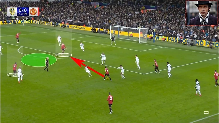 Бруно использовал свободное пространство и нашел линию передачи на Ваута. Фред в свою очередь уже был за спиной игрока в белом (как так играет Лидс? Усталость после интенсивного прессинга?) и готовился принять передачу в следящем такте.