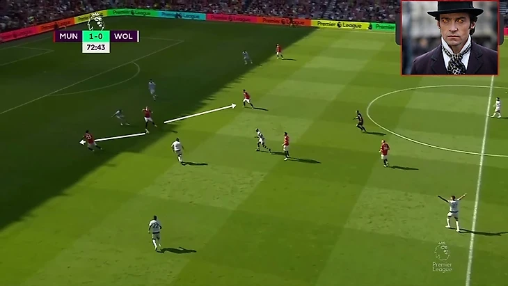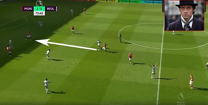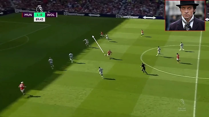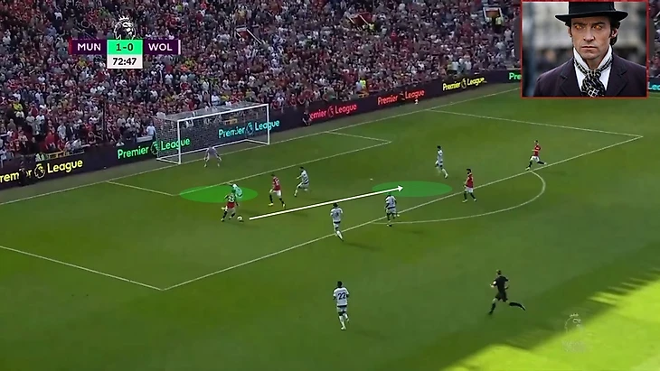 Хоть Решфорд и обыграл игрока, но и без этого действия линия передачи на Ваута была открыта. Маласия должен был понять, что линия передачи на Ваута открыта и пойти вперед в зону(если не сразу, так после обыгрыша Реши), Фрiд же в свою очередь мог просто подняться выше и тем самым или увести игрока за собой, открыв линию паса от Вегхорста на Бруно, или получить мяч самому и иметь атаку минимум 4в4 в последней трети. Но игроки ничего из этого не делают, делает лишь Ваут. (а точно именно он не уровень МЮ?)