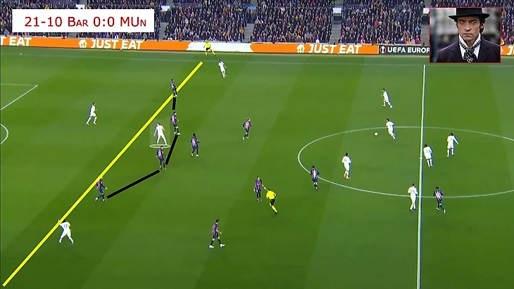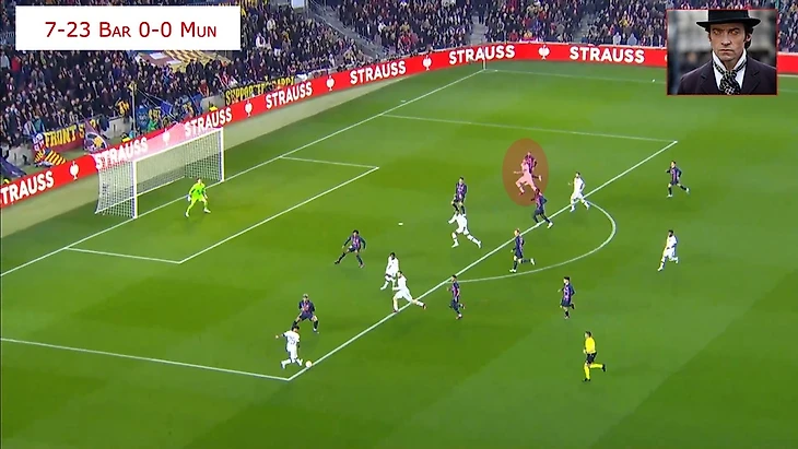 27:10 Ваут сканирует пространство и видит, что Барселона ошибается и на открытом мяче ломают линию оффсайда.