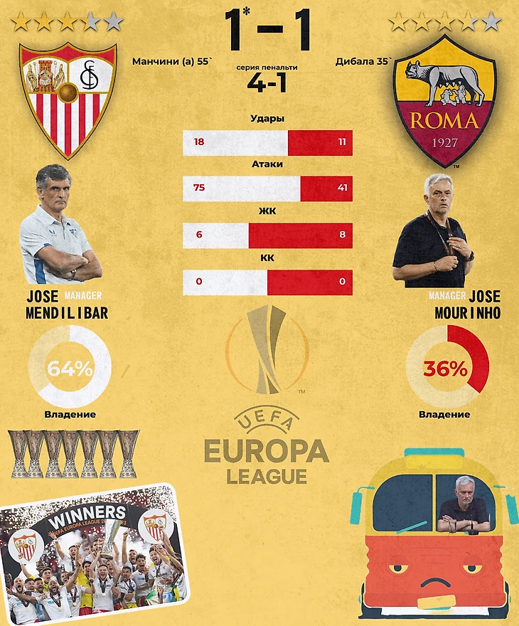 5. Игра. Рома была лучше в первом тайме, закономерно забив свой мяч. Ее острые подходы раз за разом заканчивались ударами по воротам Буну. После забитого гола на 35 минуте игра полностью перевернулась. Как бы сильно Моуринью не пытался успокоить свою команду после гола, футболисты уже готовы были праздновать взятие кубка. По итогу, римляне припарковали автобус и еле-еле дотянули до перерыва. Во втором тайме Севилья почувствовала кровь и стала наседать все сильней и сильней. Особенный перевес чувствовался на правом фланге, на котором играл Хесус Навас и Окампос. В самом начале второго тайма началось время неудач для Манчини. Он сфолил на Ламеле, тот порвал ему футболку, Манчини побежал к Тейлору, чтобы показать, как жестоко с ним обращаются и получил за это желтую карточку. В глазах итальянца виднелось полное недоумение. А через 7 минут все тот же Манчини замкнул передачу с фланга и забил гол, но есть нюанс, забил он в свои ворота, срезав мяч мимо Руя Патрисио.
