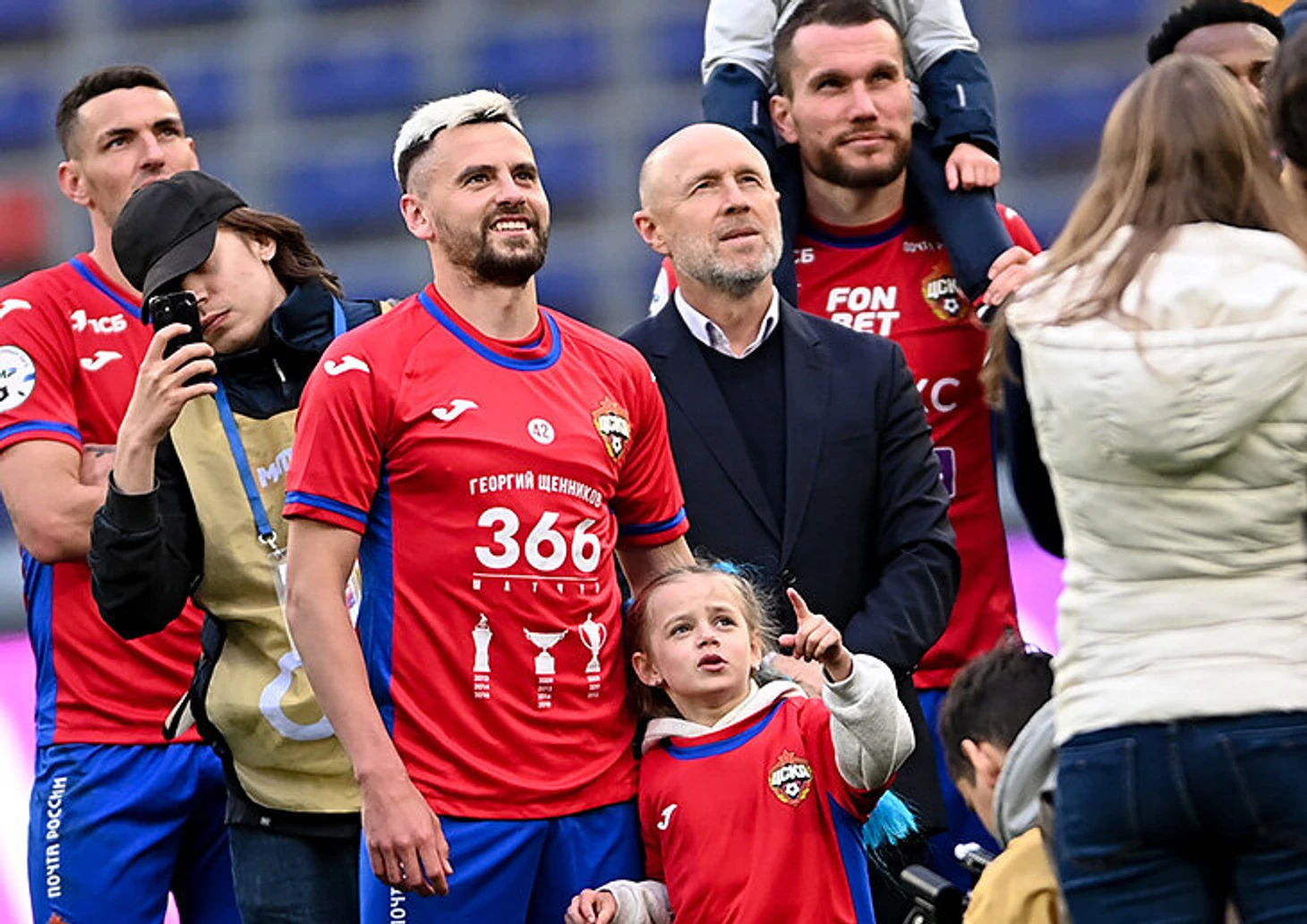 Георгий подошел к болельщикам с дочкой на шее, сделал круг по стадиону, а в центральном круге ему подарили ту самую футболку «366+1». На арене показали ролик с голами легенды: их немного, зато, например, «Реалу», «Бенфике» и «Спартаку», а также с трофеями – это три чемпионства, три Кубка и три Суперкубка.