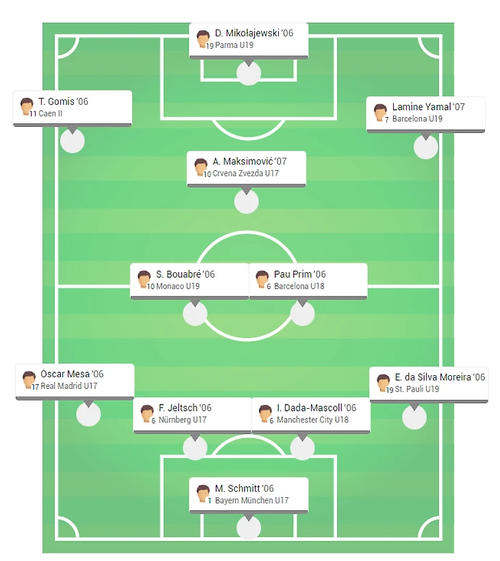 Правый вингер Ламине Ямал. Испания Барселона U16 и U19 Игрок «Барселоны». На групповом этапе провел 3 игры, забил два мяча. В плей-офф - 2 игры, 2 гола. В первую очередь хочется отметить технику и дриблинг. Игрок способен обыграть соперника, как на скорости, так и с места. Скорость один из главных преимуществ игрока. Отлично играет в пас. При любой возможности бьет по воротам соперника.