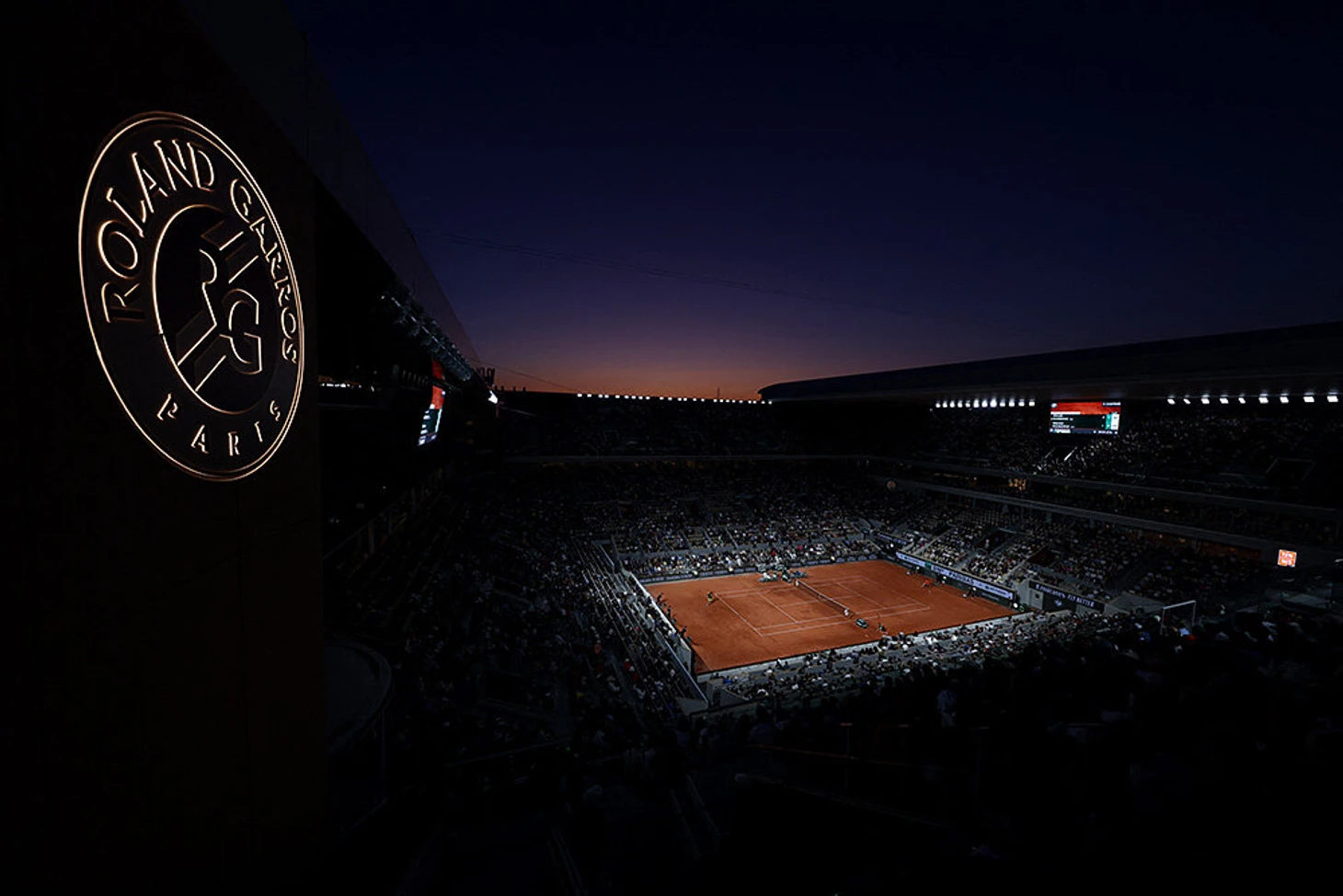 31 мая. Тоже Франция и тоже темнота. Сумеречный вид на Корт имени Филиппа Шатрие, главную площадку «Ролан Гаррос».