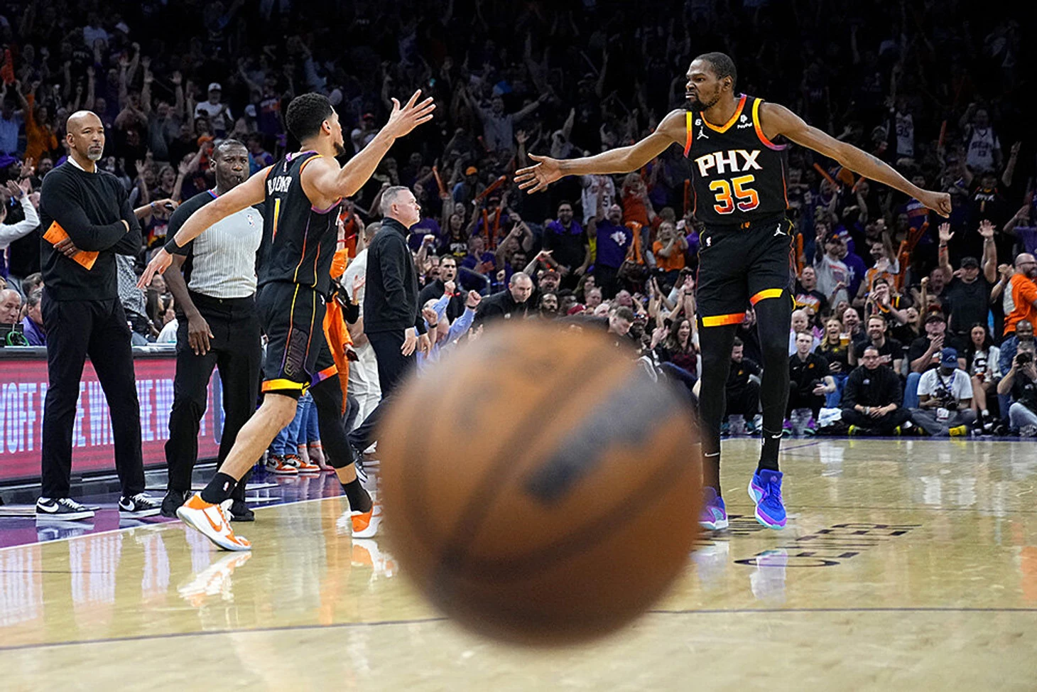 5 мая. Спустя неделю после этого фото Дюрэнт и Букер вылетят из плей-офф, а тренер Уильямс – из клуба. Но пока летящий на нас мяч делает празднование суперзвезд «Финикса» еще драйвовее и яростнее.