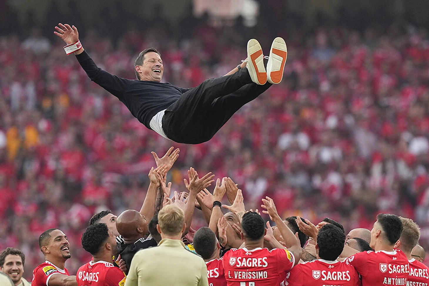 27 мая. У этого фото совсем другое настроение. «Бенфика» выиграла чемпионство впервые за четыре года, и Рогер Шмидт взмывает вверх.