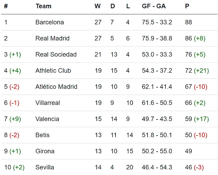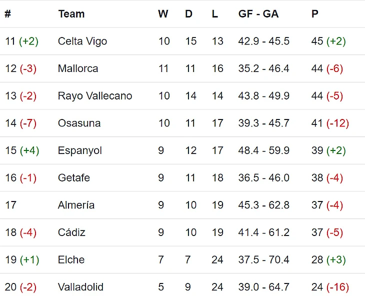 Первое, что бросается в глаза при просмотре второй половины таблицы, это наличие там команды, которая будет представлять Испанию в еврокубках в следующем сезоне. Осасуна в этом сезоне точно прыгнула выше головы. Команда из Памплоны повторила маршрут Валенсии, только в обратном направлении, потеряв 7 позиций.