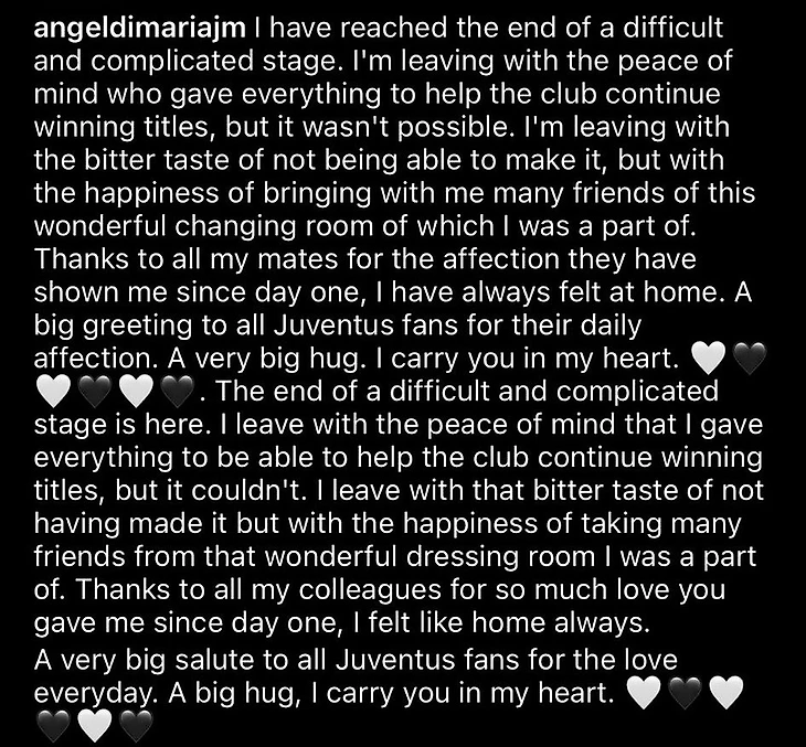 Анхель Ди Мария больше не является игроком «Ювентуса». 35-летний аргентинец, отдыхающий на Ибице со своей семьей, опубликовал прощальное письмо в Instagram.