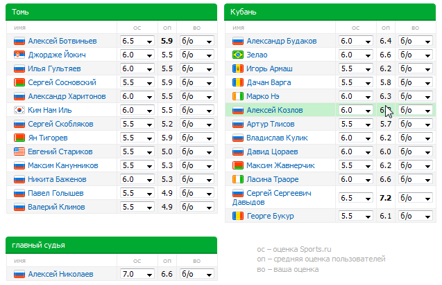 В новом сезоне оценки футболистам дают не только журналисты, но и все болельщики – при помощи новой вкладки «оценки» в онлайнах матчей. Лучшие футболисты чемпионата России и каждого клуба по версии болельщиков получат призы от Sports.ru и Supra. Кроме того, вы можете поделиться своими оценками с друзьями (по специальной прямой ссылке), даже если почему-то все еще не зарегистрированы на сайте. Оценки зарегистрированных пользователей в дальнейшем будут доступны из их профиля – можно будет посмотреть, кого и как оценивал тот или иной пользователь, и даже лучшего игрока турнира/команды по его версии.