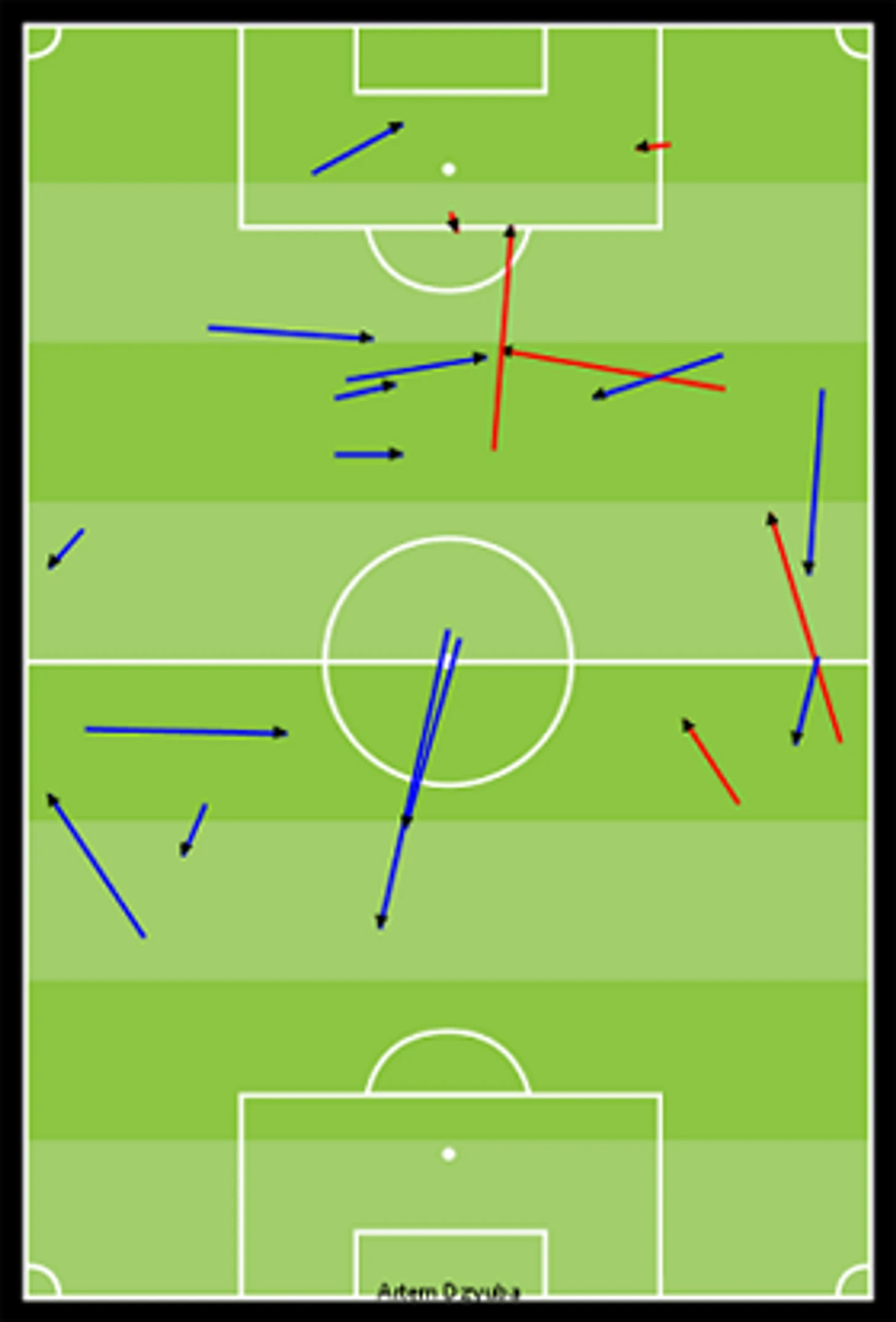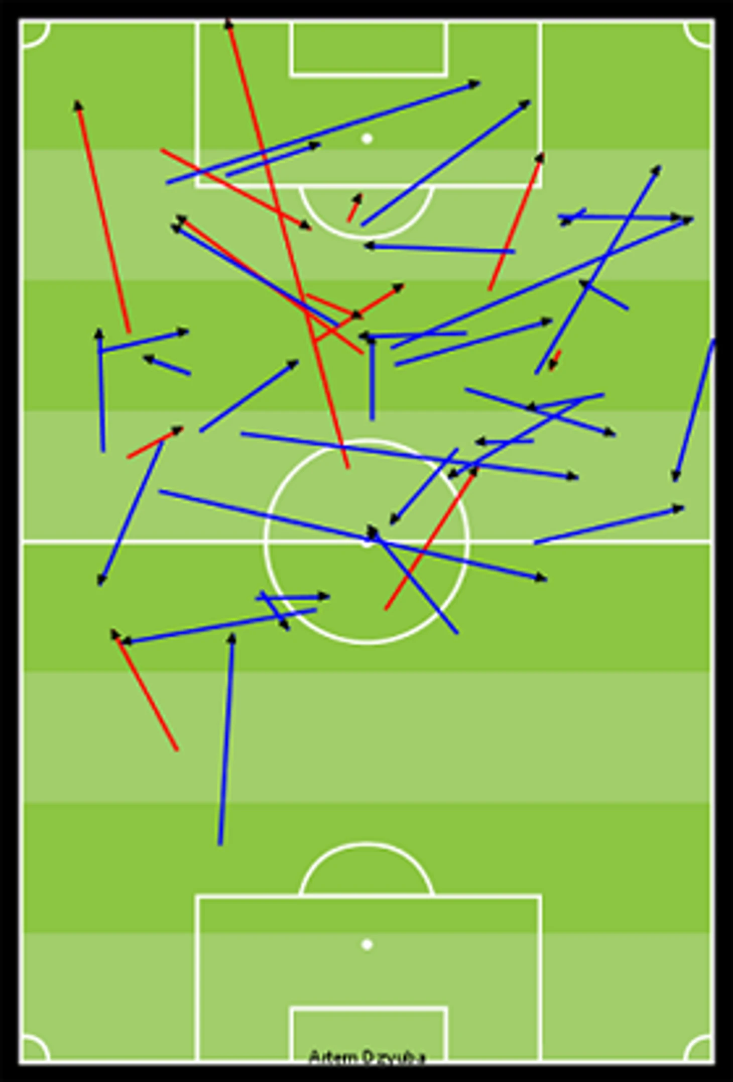 Изменение игровых функций Дзюбы хорошо видно на графиках сделанных им передач в двух разных домашних матчах – за «Томь» в прошлом сезоне и «Спартак» в нынешнем; обе игры Артем провел целиком и довольно успешно (синим цветом отмечены точные передачи, красным – неточные).