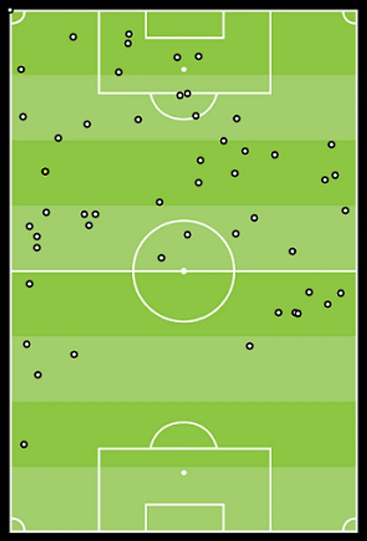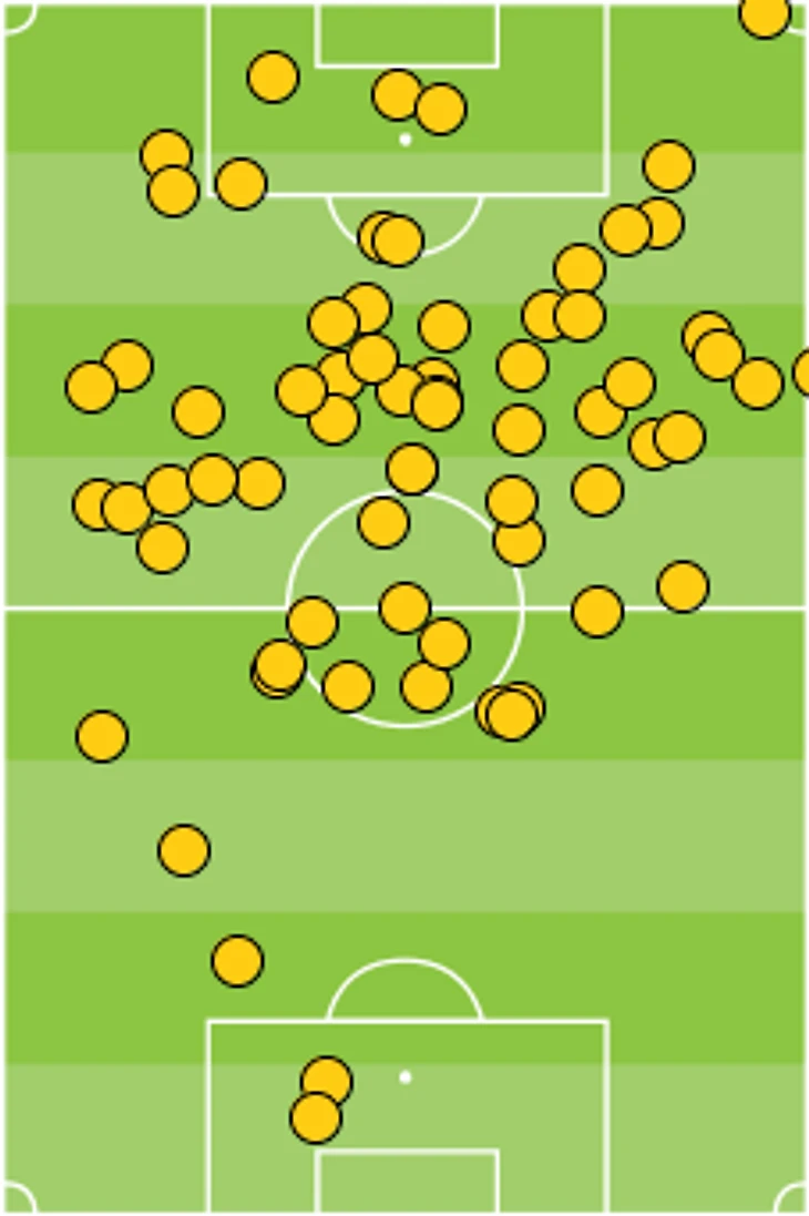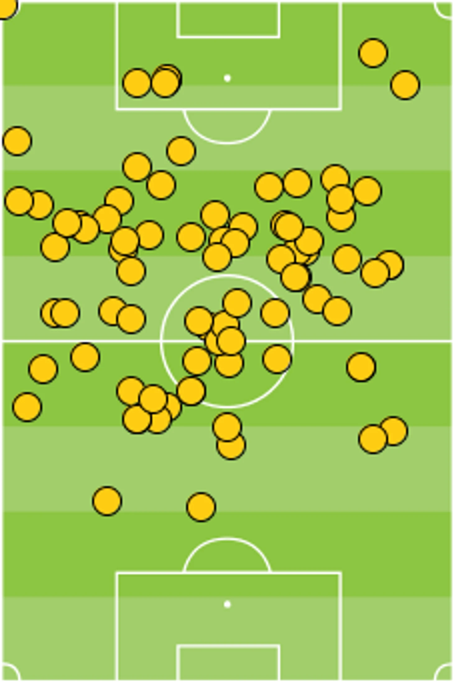 В условиях постоянных перестановок и лимита Дзюба занял место нападающего второго темпа, где и играл Алекс – разве что чуть глубже, так как у бразильца было все в порядке с длинным и средним пасом, а вот Артему для лучшего взаимодействия с Веллитоном нужно было располагаться ближе к чужим воротам. На графиках касаний мяча хорошо видно, что Алекс начинал этот сезон практически с тем же объемом действий, который потом достался Дзюбе.
