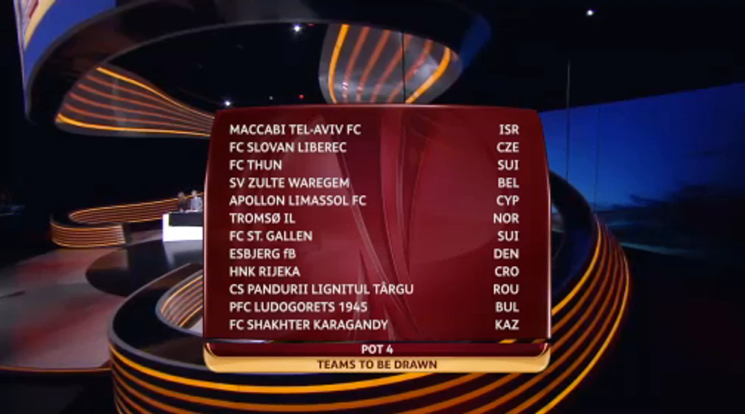 Четвертая корзина: Маккаби Тель-Авив, Слован, Тун, Зюлте-Варегем, Аполлон, Тромсе, Санкт-Галлен, Эсбьерг, Риека, Пандурий, Лудогорец, Шахтер Караганда.