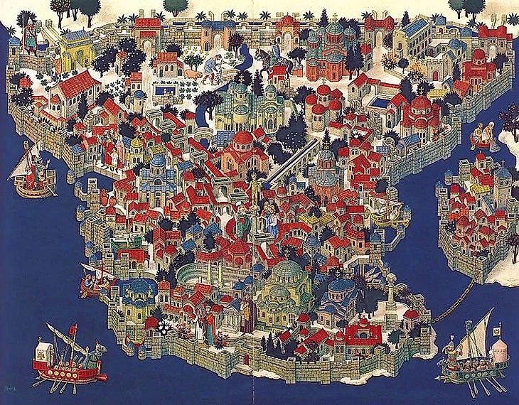 Одно из самых известных упоминаний Константинополя в контексте русской истории встречается в «Повести временных лет». В написанной в XII веке монахом Нестором летописи говорится о походе князя Олега на Царьград – так на Руси называли столицу Византии. Указано, что дружина дошла до Босфора приблизительно в 907 году, хотя точная датировка вызывает у историков большие сомнения. В тексте Нестора утверждается, что в поход отправились несколько союзных племен – скандинавских, славянских и финно-угорских (варяги, словене, чудь, кривичи, меря, древляне, поляне и так далее), причем часть из них шла по земле, а часть – по морю.