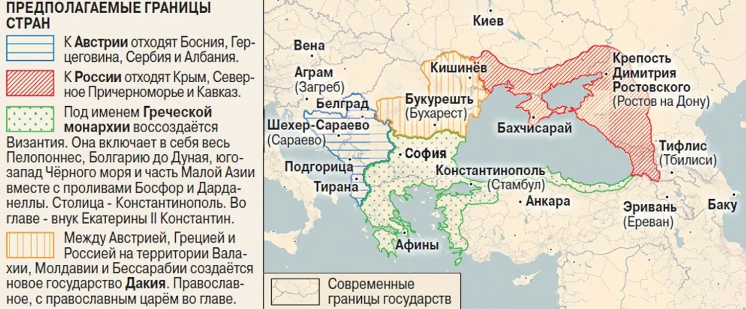 Идея о новом «щите на воротах Царьграда» так и осталась лишь политическим проектом. Окончательно его похоронил Павел I, не желавшим продолжать дело Екатерины II. Тем не менее в конце XVIII века при дворе обожали все греческое. Во времена Екатерины II в Царском селе заложили район София с храмом, похожим на византийский. В 1794 году город на месте турецкой крепости Хаджибей назвали Одессу – в честь античной колонии. А ещена карте появились топонимы, оканчивающиеся на «поль» (от греческого – полис) – Севастополь, Симферополь, Никополь и так далее.