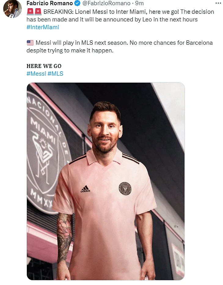 «Лионель Месси переходит в «Интер Майами», поехали! Решение принято, и Лео объявит о нем в ближайшие часы. В следующем сезоне Лео будет выступать в МЛС».