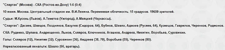 К 80-й минуте результат был еще более унизительным для команды Константина Бескова (0:6), но Федор Черенков все-таки смог забить гол престижа. А у гостей дублем отметился культовый ростовский форвард Сергей Андреев.