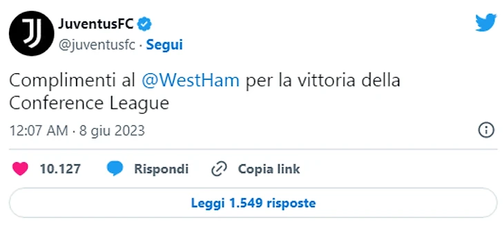«Вест Хэм» обыграл «Фиорентину» в финале Лиги конференций (2:1), и получил поздравления от «Ювентуса», который после завершения матча написал в Твиттере: «Поздравляем «Вест Хэм» с победой в Лиге конференций».