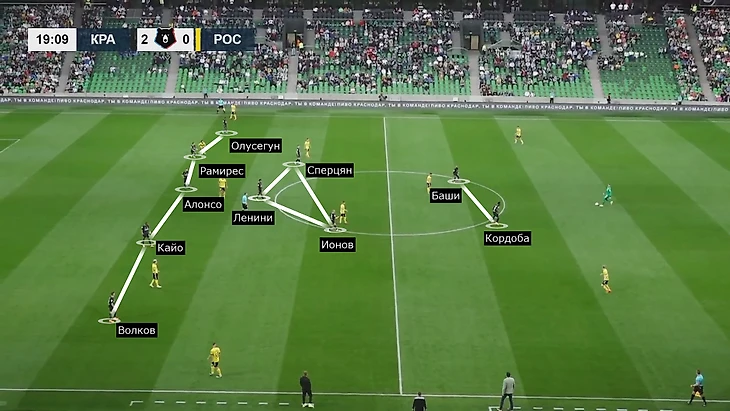 Против «Ростова» (4:1) и ЦСКА (0:0) Ивич пошел еще дальше: Олусегун и Волков превращались в полноценных латералей, Рамирес вставал в тройку центральных (выбрасывался за Байрамяном и Обляковым), а Ионов становился восьмеркой в центре поля.
