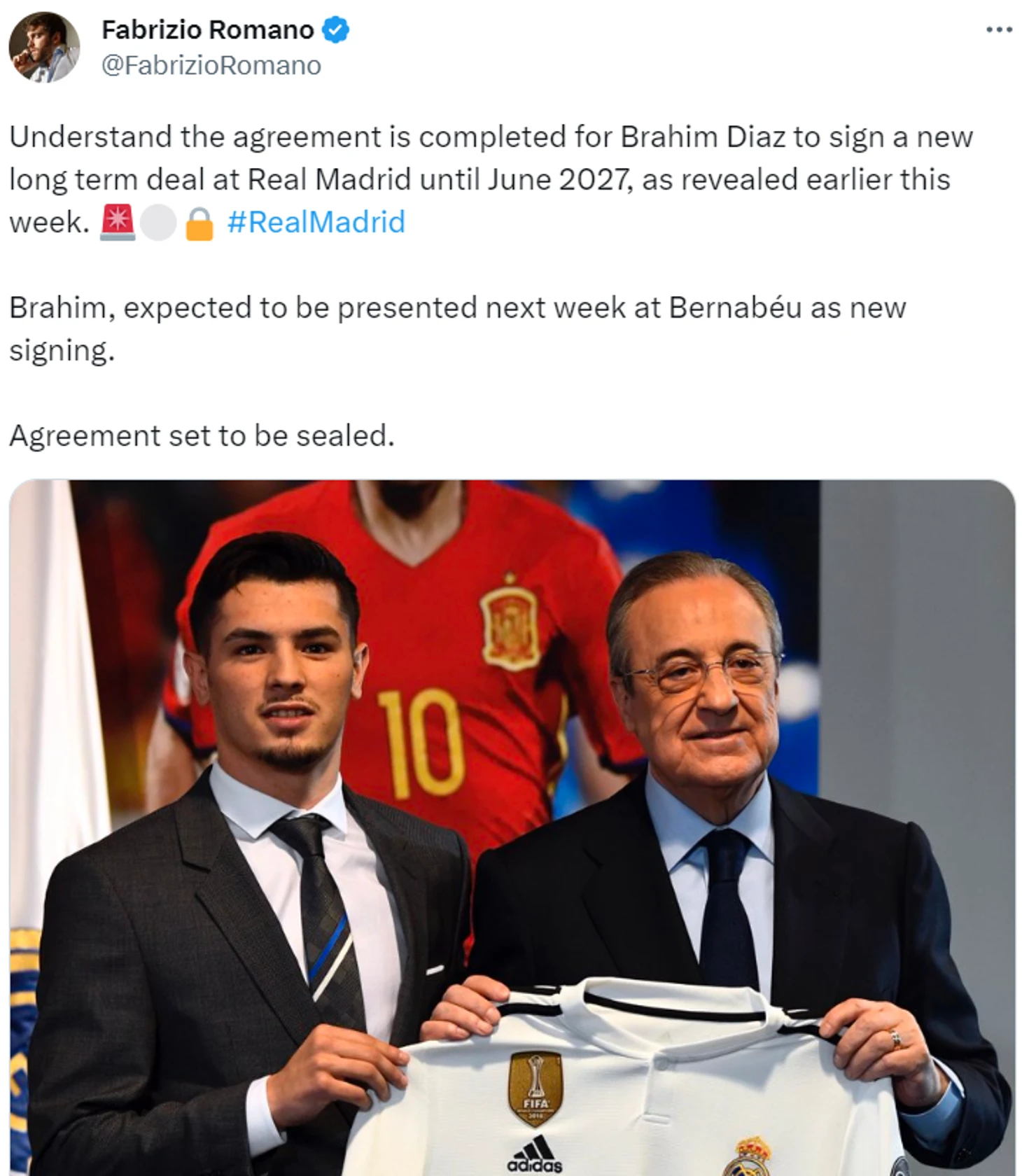 «Стало известно, что соглашение «Реала» и Браима Диаса достигнуто. Клуб подпишет с игроком новый долгосрочный контракт до июня 2027 года. Ожидается, что презентация Браима на «Бернабеу» пройдет на следующей неделе».