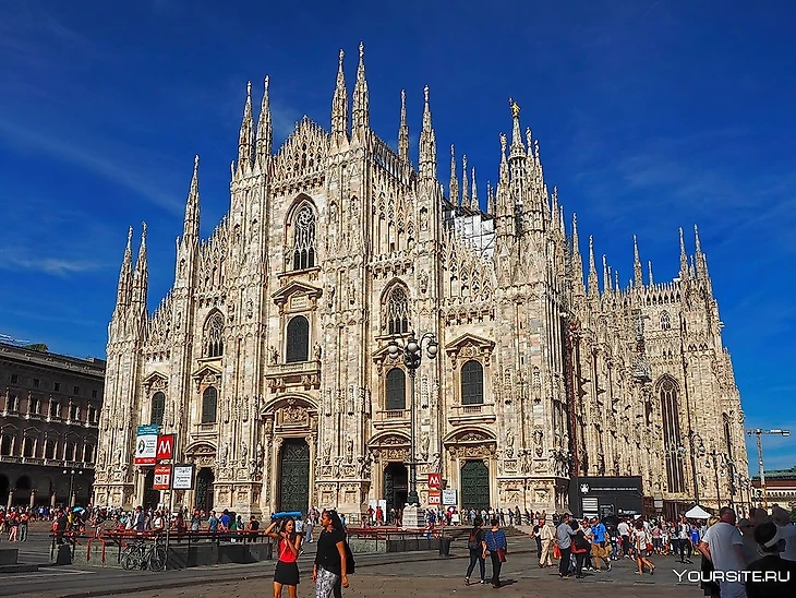 Главная достопримечательность Милана, его сердце – кафедральный собор Санта Марии Нашенте. Он выполнен в готическом стиле из белого мрамора и поражает красотой внешнего оформления. Фасад украшен башенками, статуями святых, композициями, изображающими библейские истории, фигурами диковинных существ, в том числе горгулий. Над всем этим возвышается фигура Мадонны – именно она считается покровительницей города.