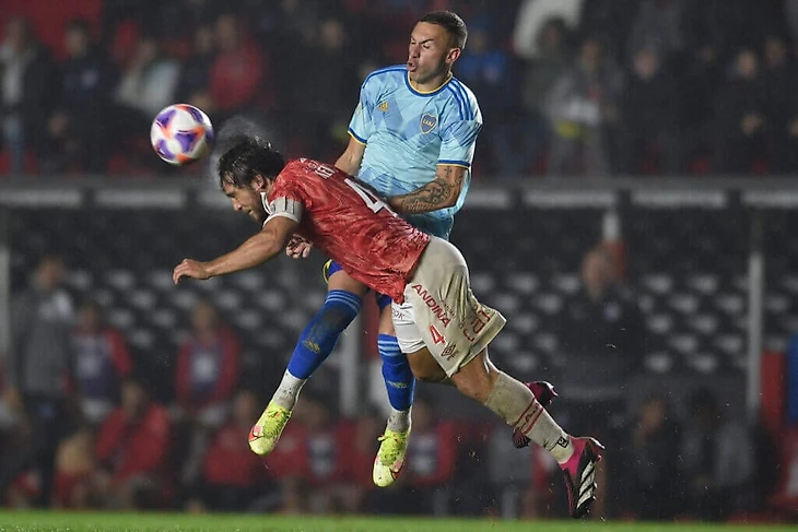 Кевин Мак Аллистер бьет головой за «Аргентинос Хуниорс» в прошлом месяце (Фото: Густаво Гарелло via Getty Images)