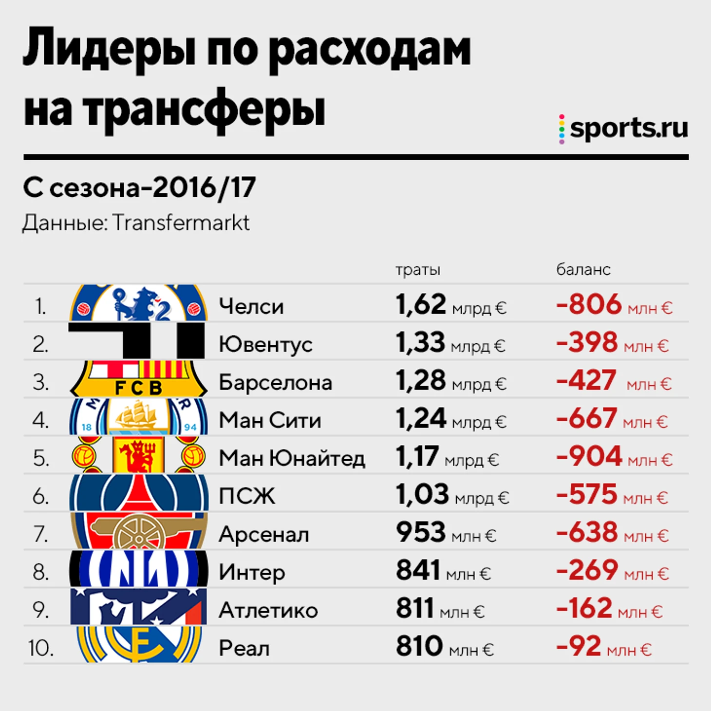 Безусловно, «Ман Сити» тратил в эти годы очень много, но он не лидер по трансферным расходам. Более того, «Ман Сити» даже не в тройке. Впереди «Челси», «Ювентус» и «Барселона». «Ман Юнайтед» потратил только на 100 млн меньше соседей, но при этом меньше и заработал на трансферах.