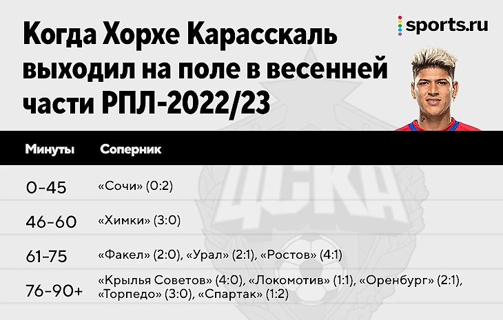 Казалось, ЦСКА идеально вложился в Карраскаля после неоднозначной полугодовой аренды (по данным Transfermarkt, Хорхе выкупили за 6 миллионов евро), но после замены в октябрьском дерби со «Спартаком» (2:2) влияние Хорхе резко снизилось. Весной Карраскаль – даже не первый запасной на место инсайда.