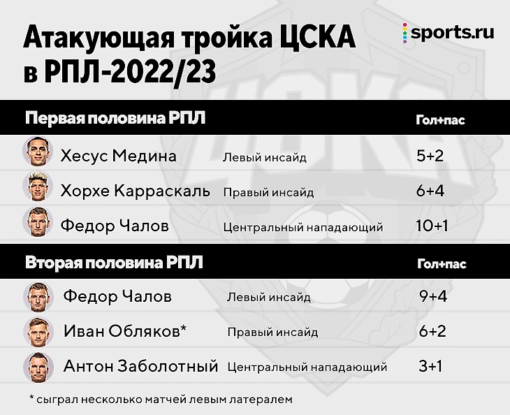 Как перестроился ЦСКА: Чалов и Обляков – инсайды, Медина – латераль, Карраскаль редко выходил даже на замену